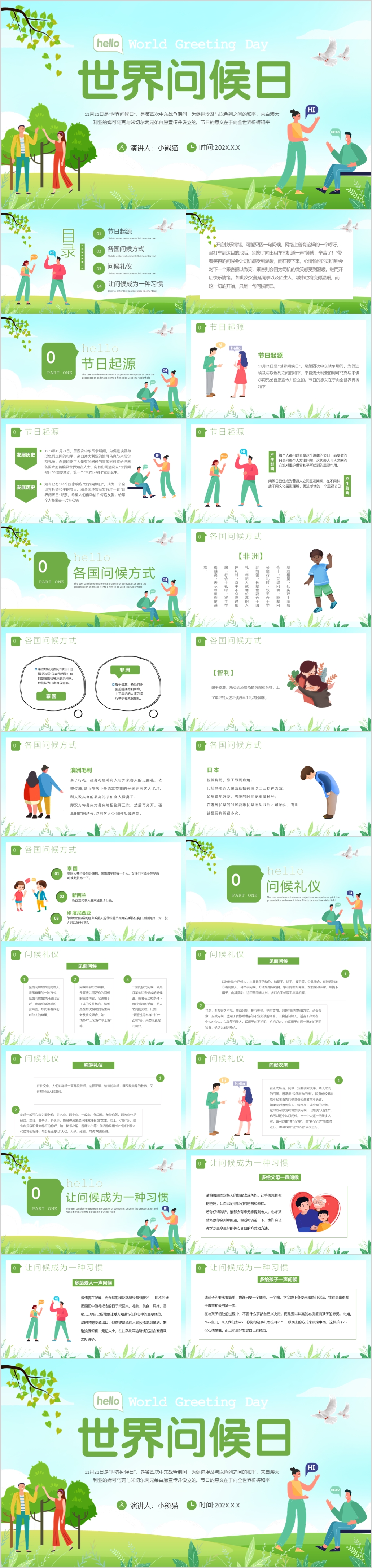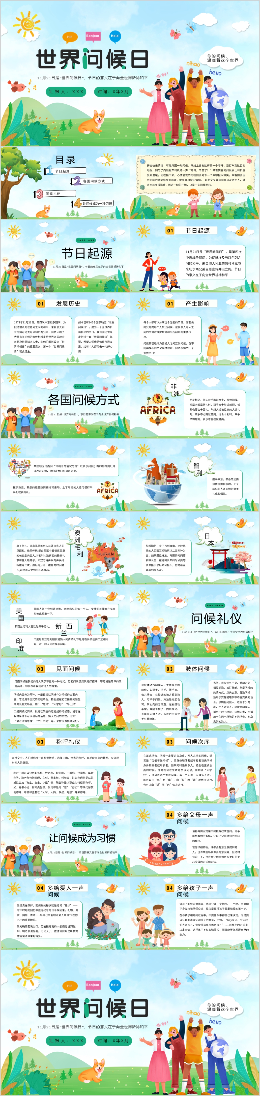 卡通风世界问候日节日宣传通用主题班会介绍PPT模板