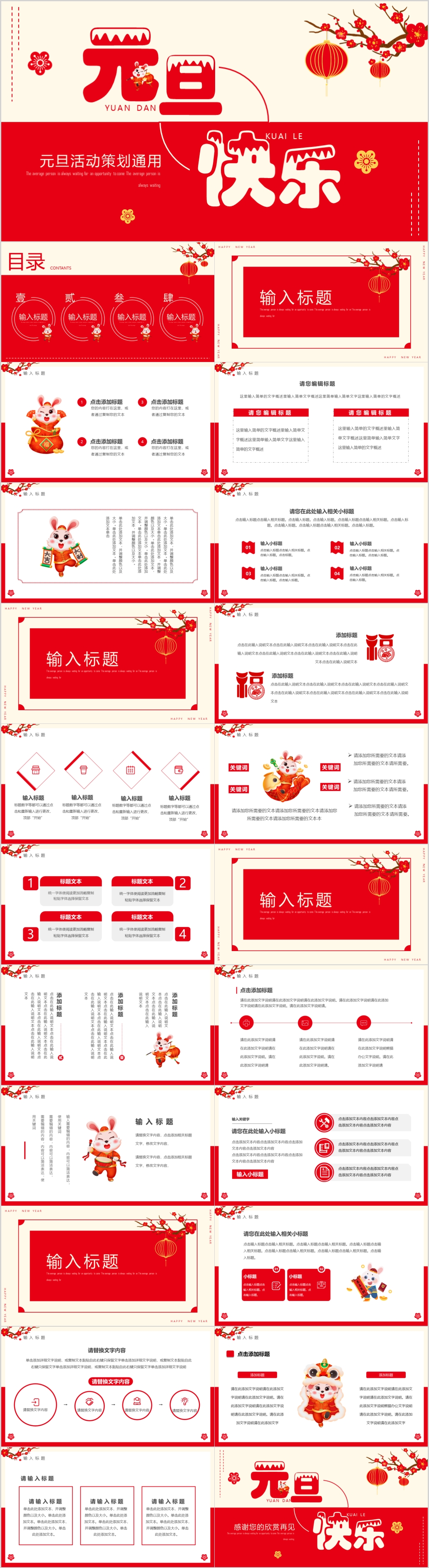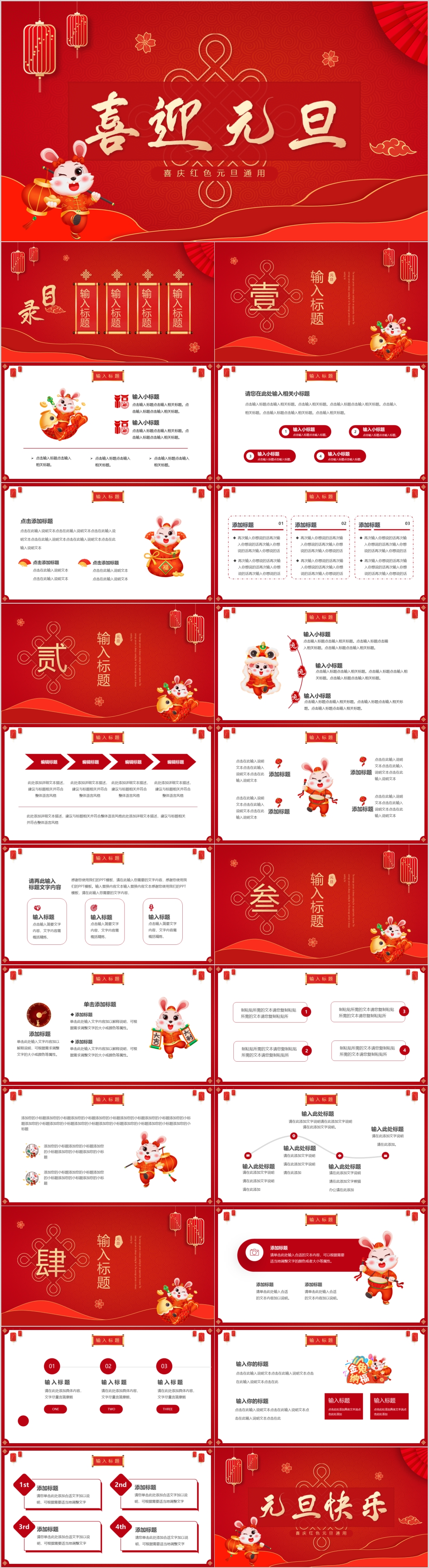 红色简约兔年元旦快乐节日介绍通用ppt模板