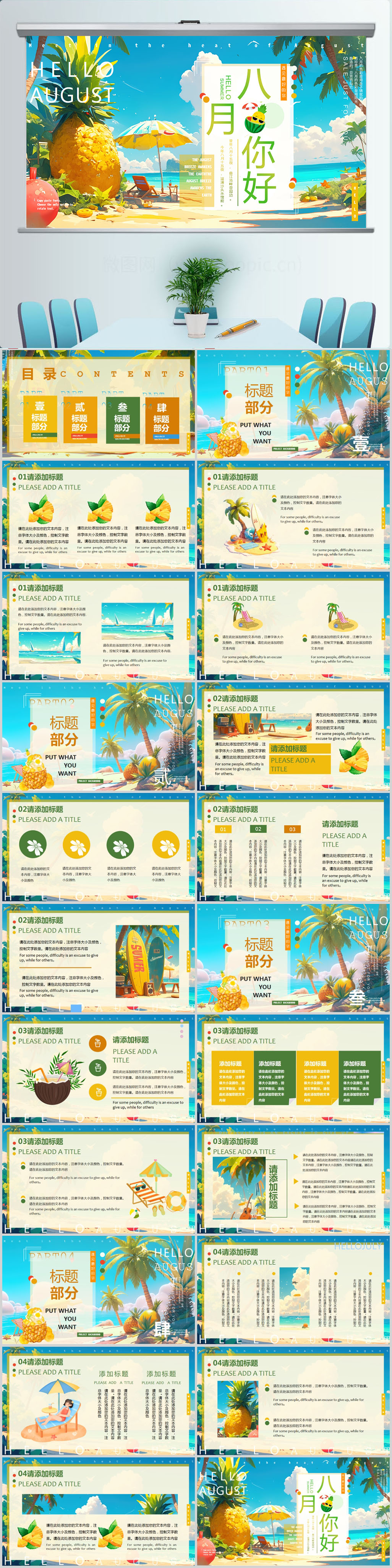 小清新简约八月你好工作汇报ppt模版设计