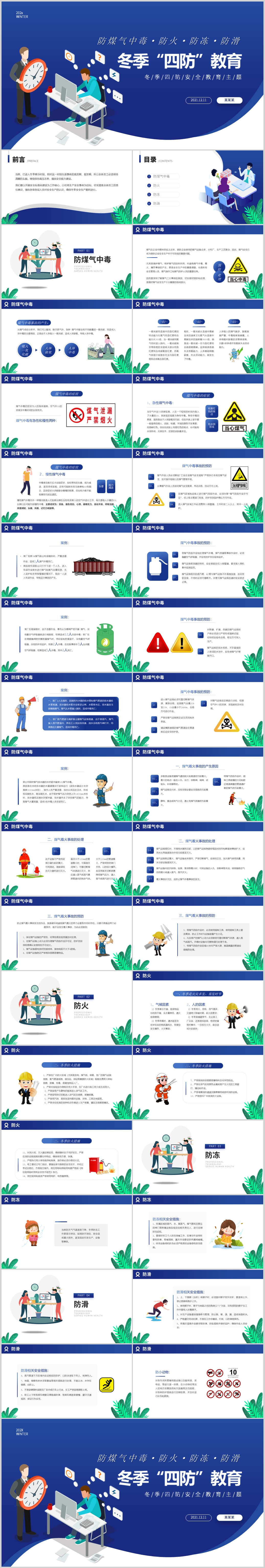 卡通冬季预防煤气中毒防火防冻防滑四方主题教育班会PPT模板
