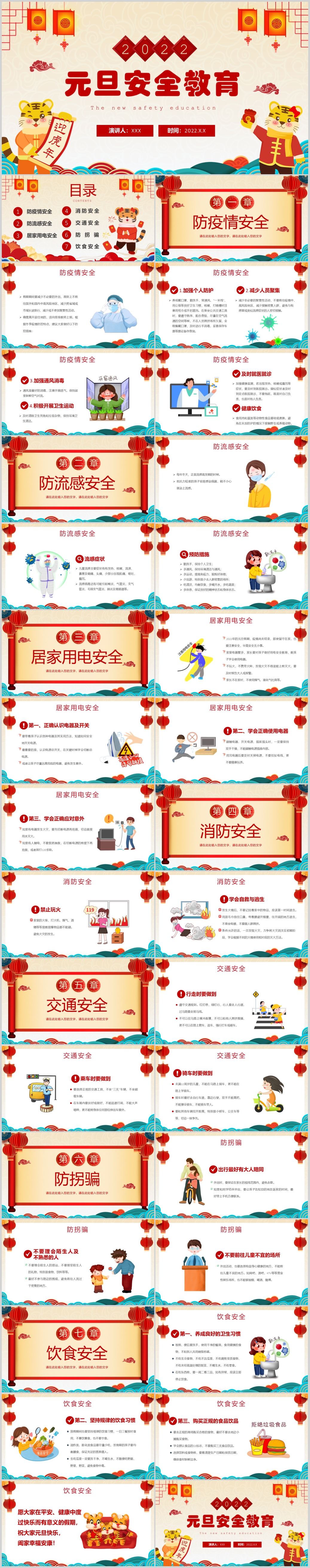 卡通中小学生幼儿园新年快乐元旦安全主题班会课件PPT模板