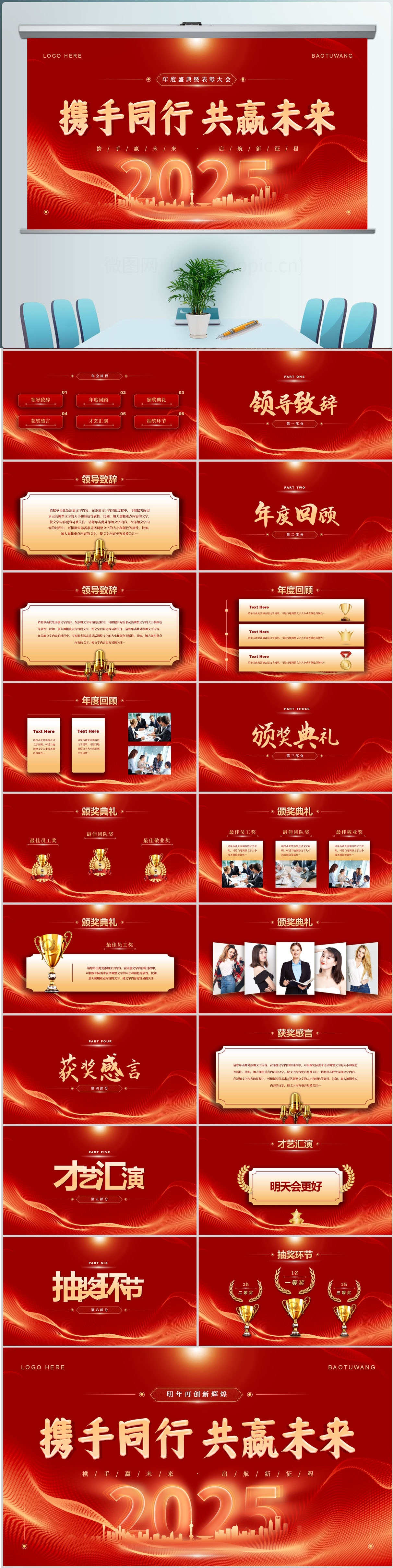 红色携手同行 共赢未来企业年终总结年会颁奖典礼ppt模板