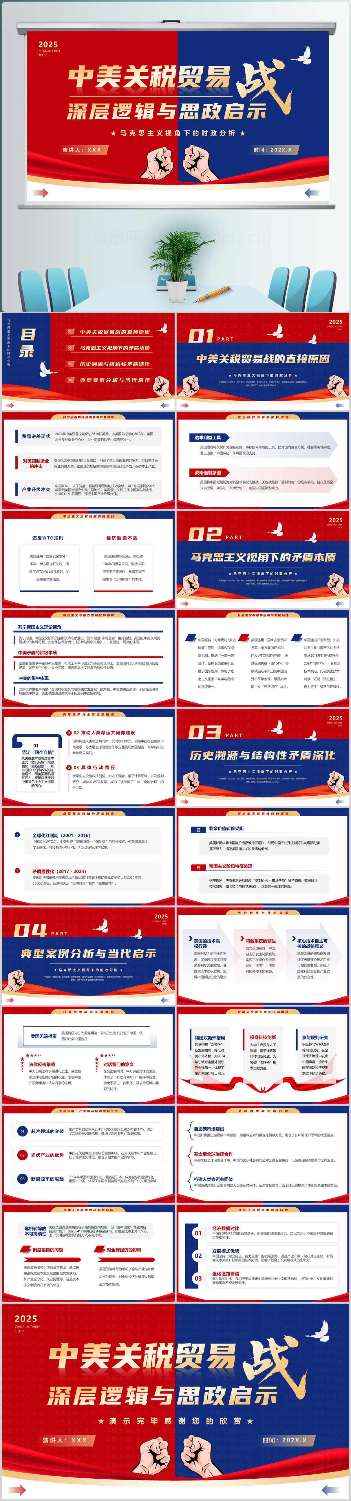 红蓝简约风中美关税贸易战思政启示PPT模板设计