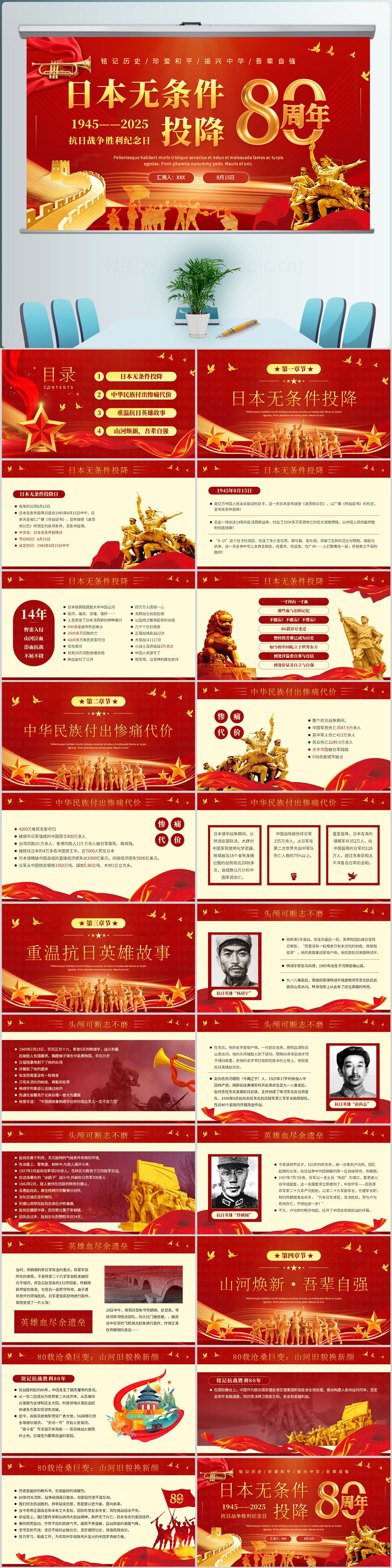 中国风纪念抗日战争胜利80周年专题党课PPT模板(内含WORD演讲稿)