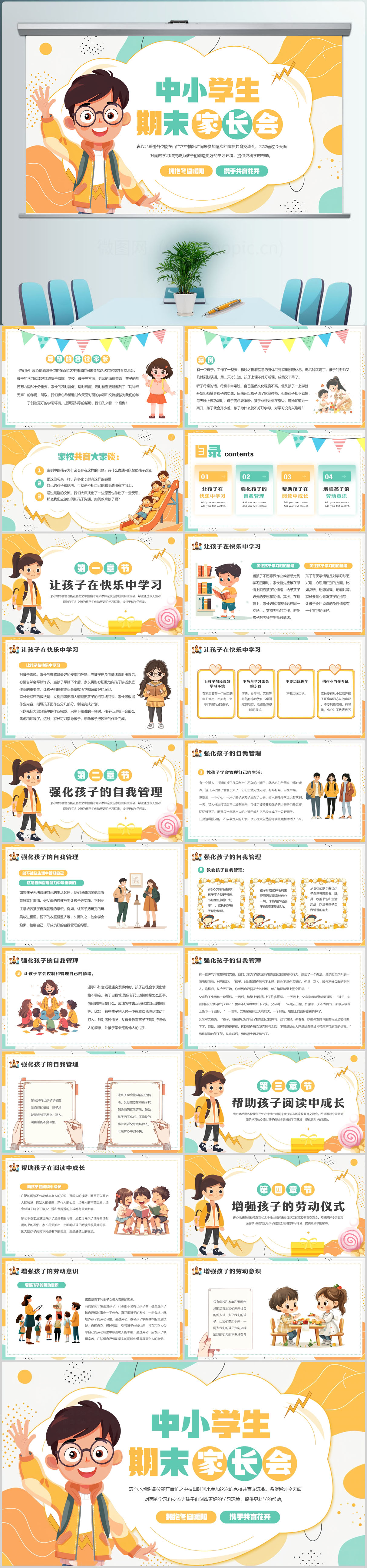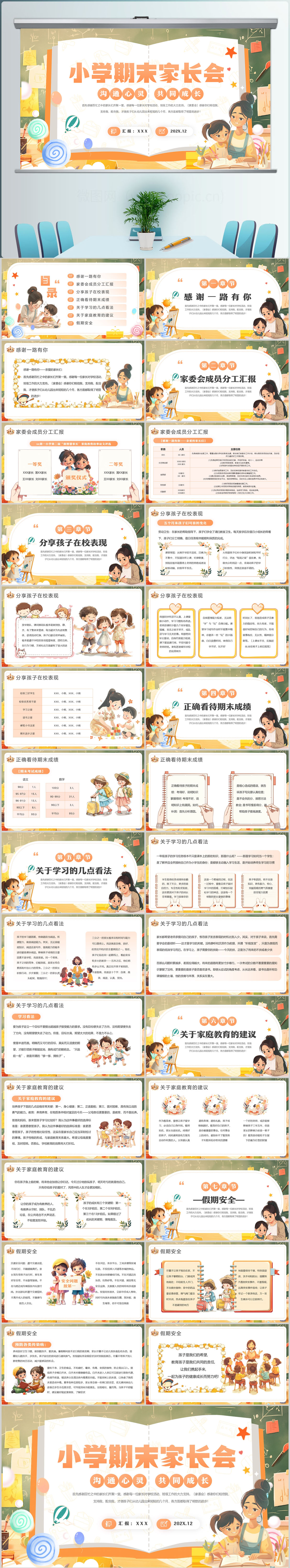 卡通风中小学生期末家长会PPT模板设计