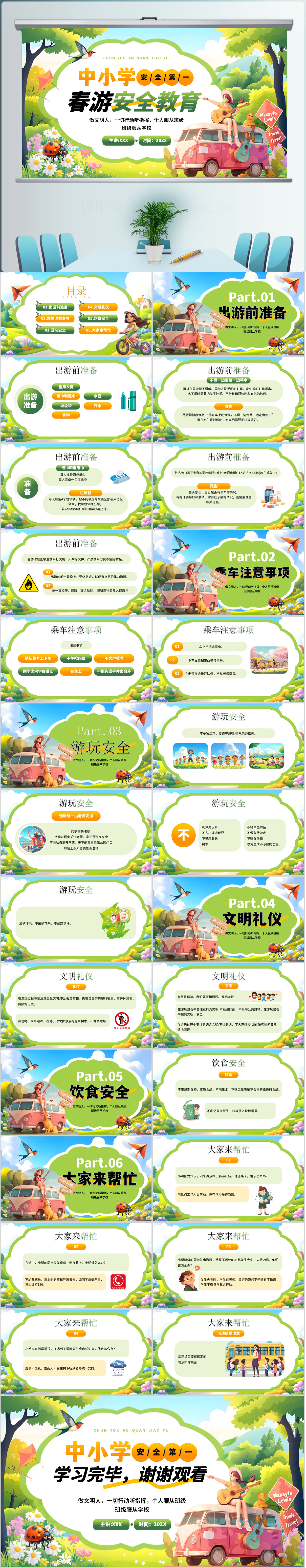 卡通中小学生春游出行安全教育培训班会主题课件ppt模板