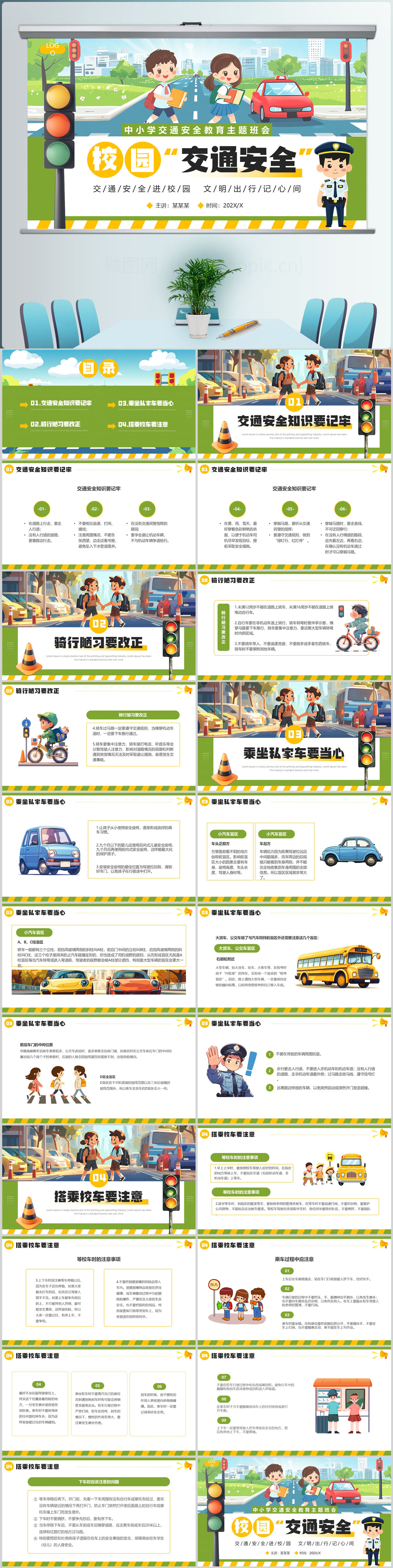 绿色插画风校园交通安安全PPT模板设计