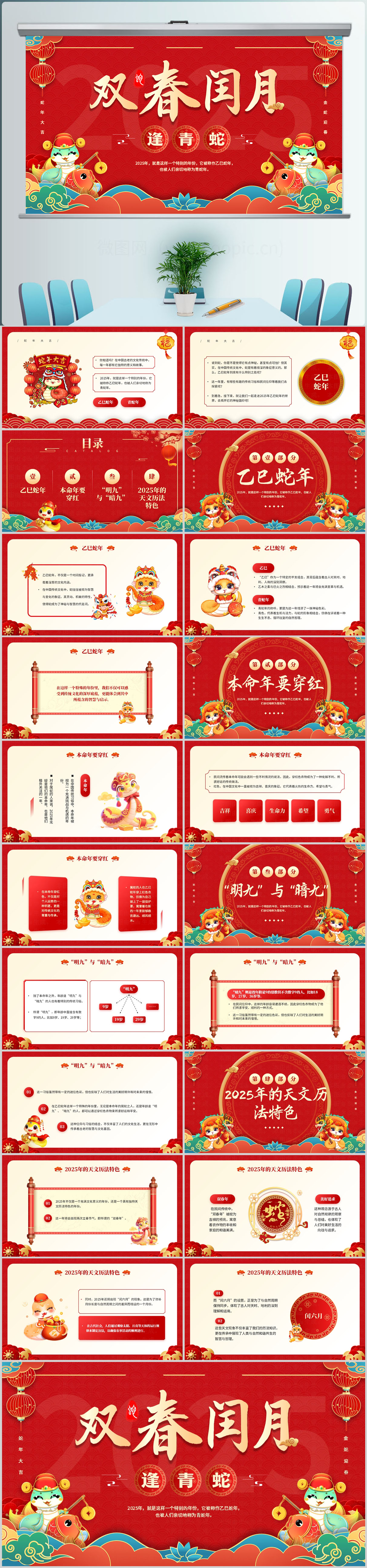 中国风2025双春闰月逢青蛇PPT模板设计