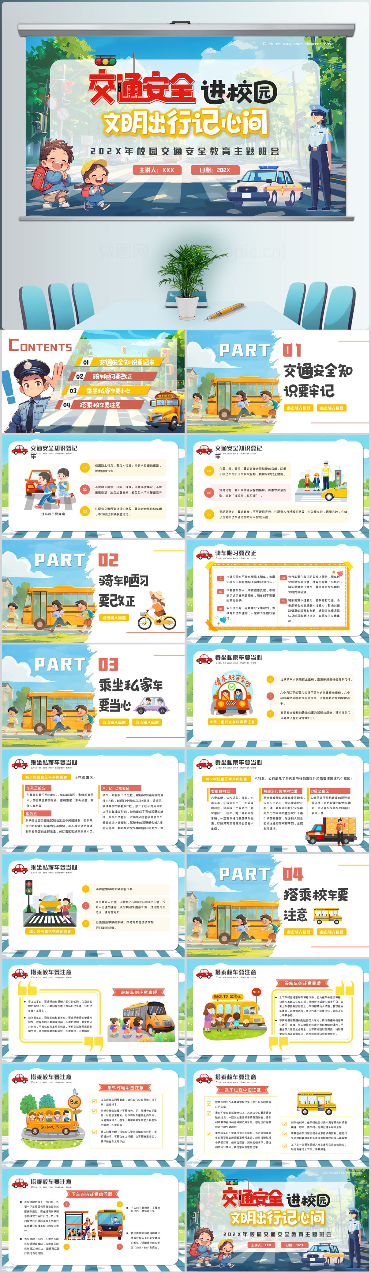卡通插画风校园交通安全教育PPT模版设计