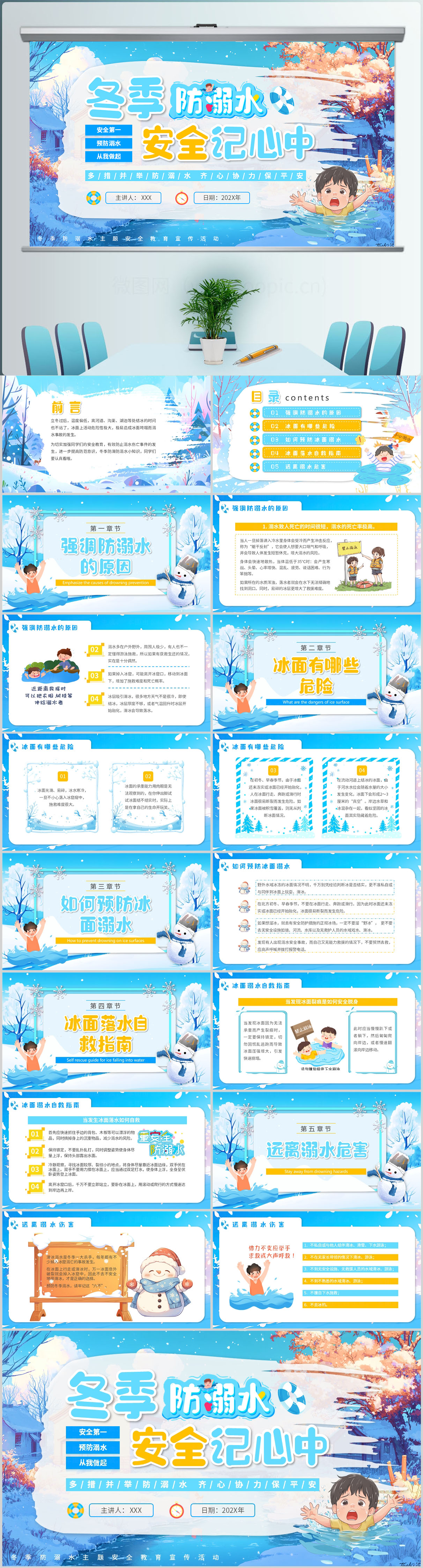 卡通冬季防滑防溺水主题班会PPT模板设计