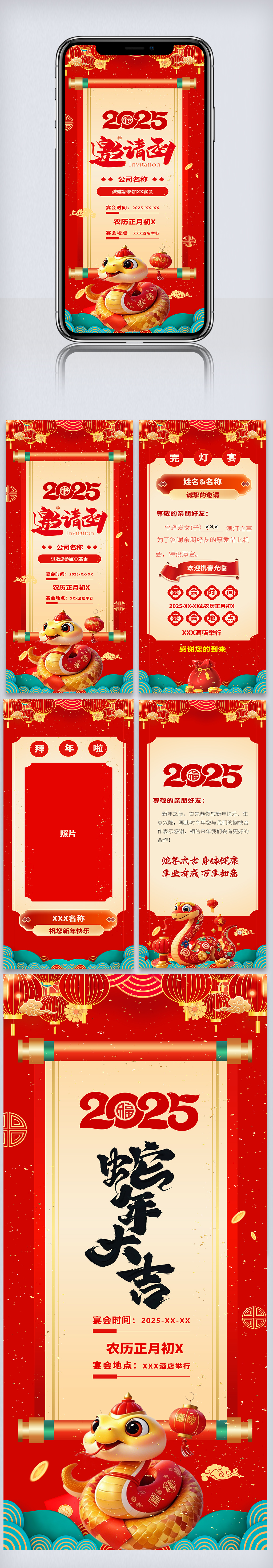 2025红色手机竖立完灯宴会拜年春节新年贺卡邀请函ppt模板