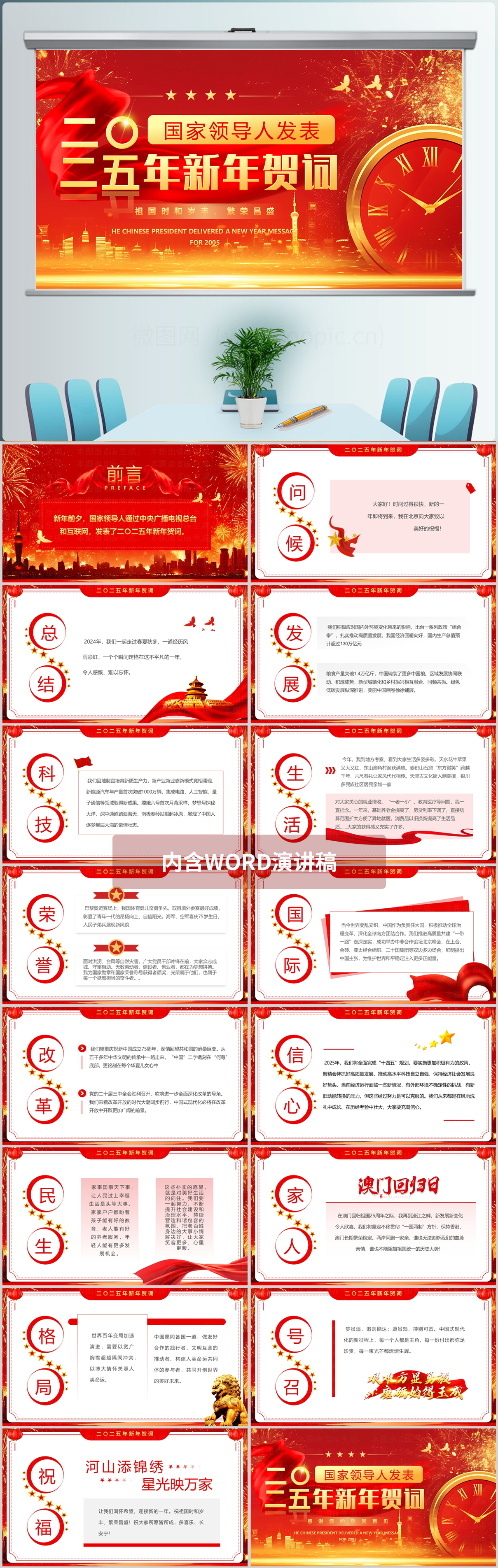 红色大气二〇二五年新年贺词学习ppt模板(内含WORD演讲稿)