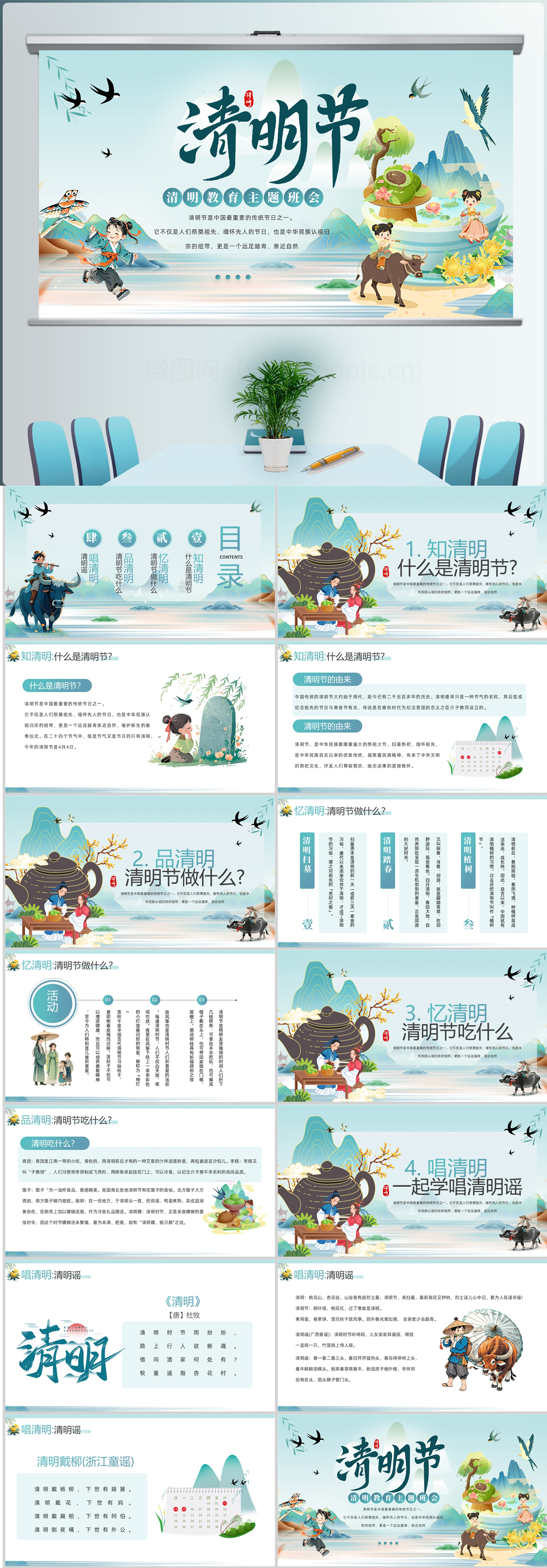 清新中国风中国传统节气清明节介绍主题班会PPT模板
