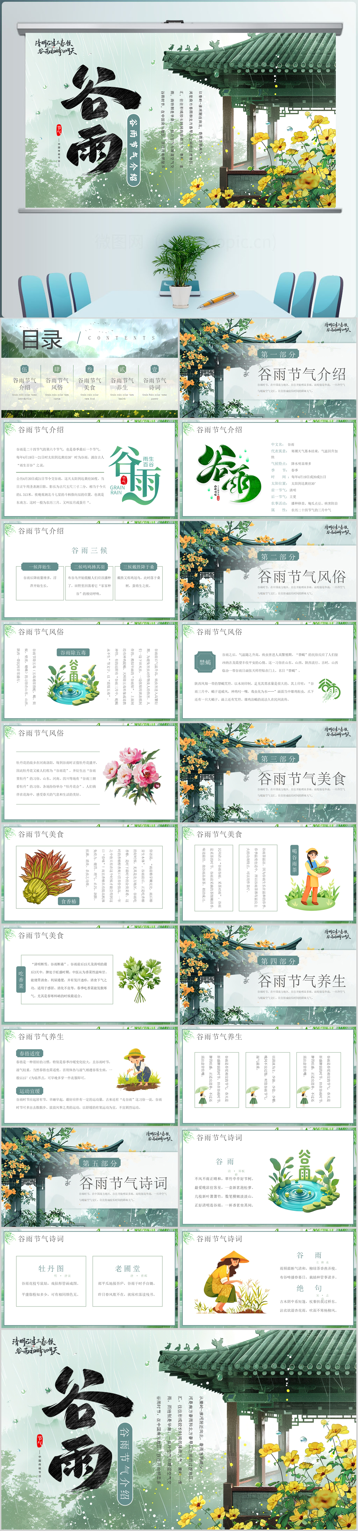 绿色小清新传统二十四节气谷雨节气介绍ppt模板