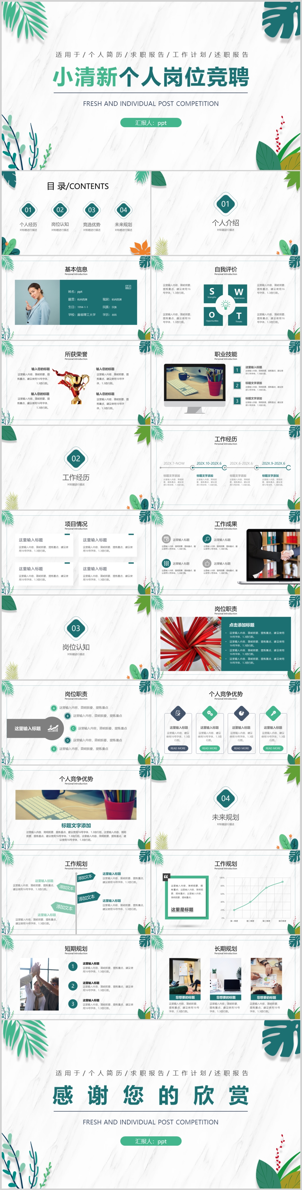 绿色小清新岗位竞聘报告竞岗演讲求职个人简历PPT模板