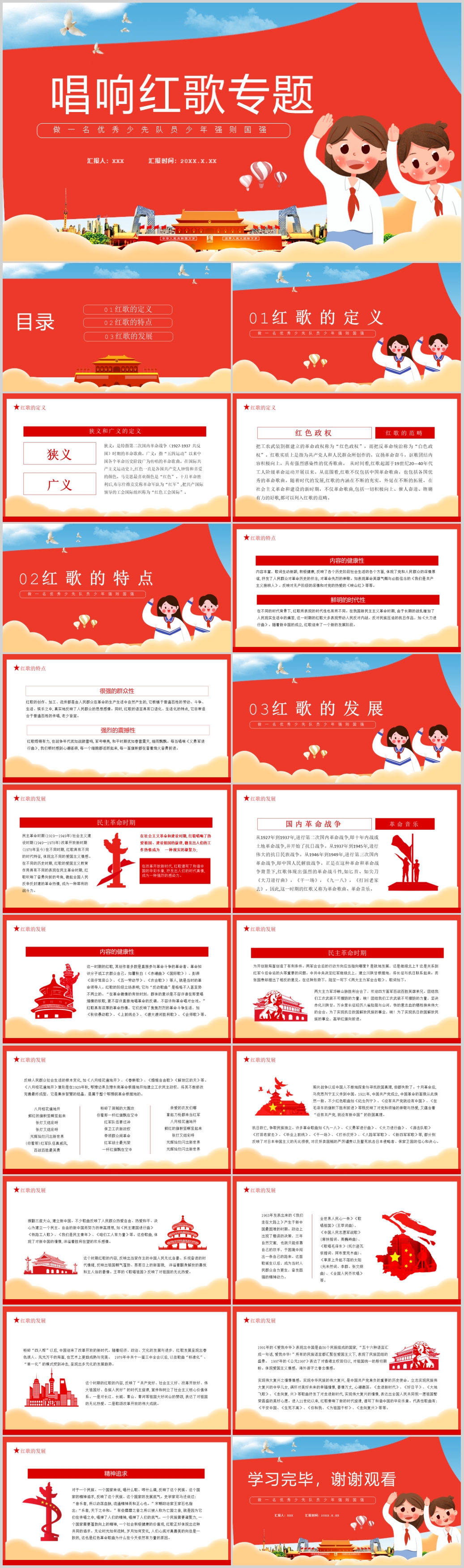 卡通少先队员唱响红歌专题班会主题课件PPT模板