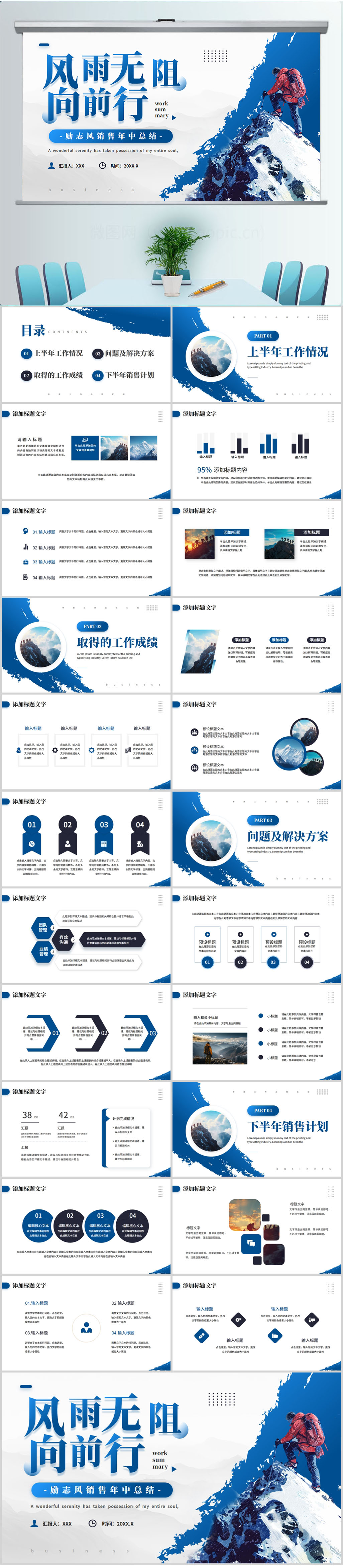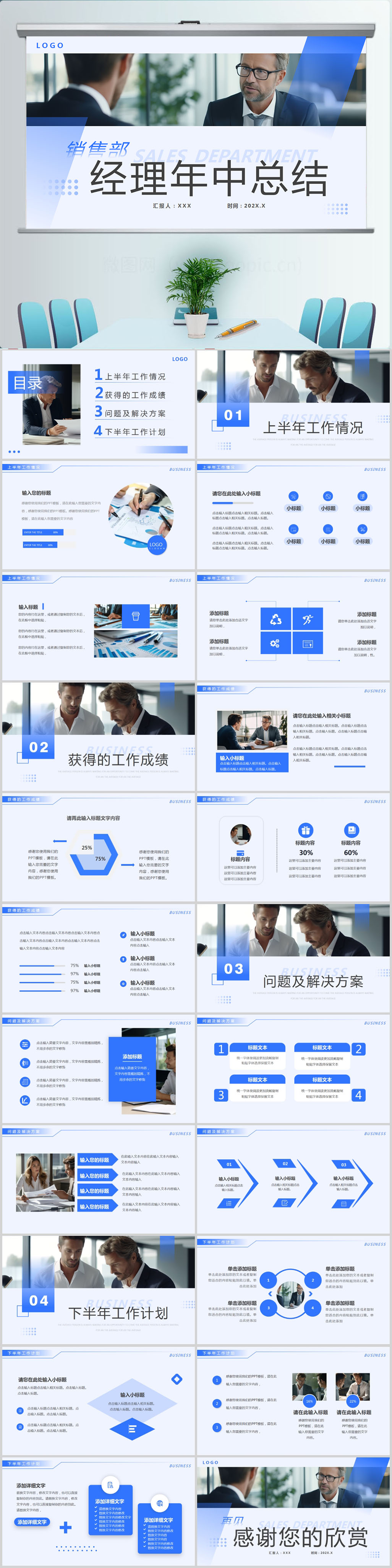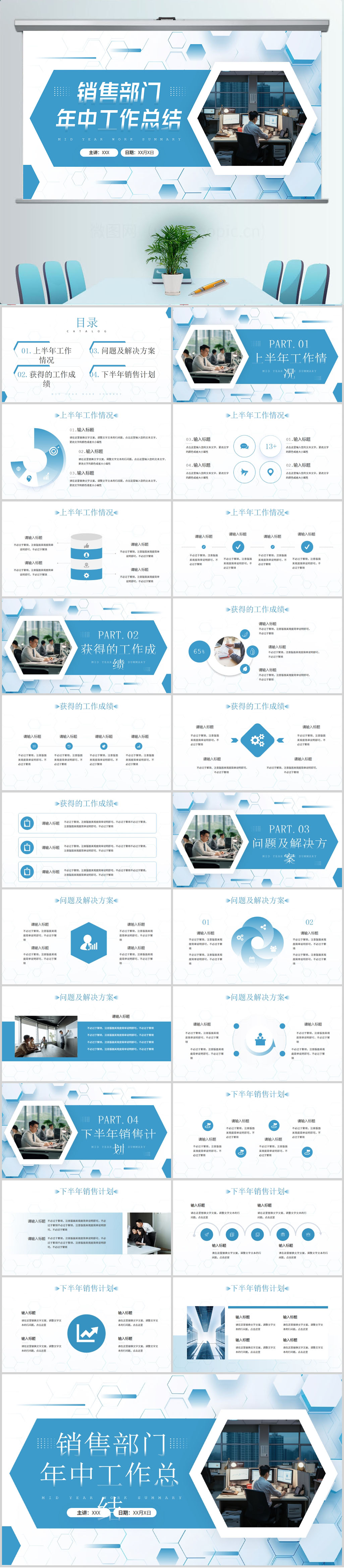 蓝色简约商务年中工作总结工作汇报述职报告ppt模板设计