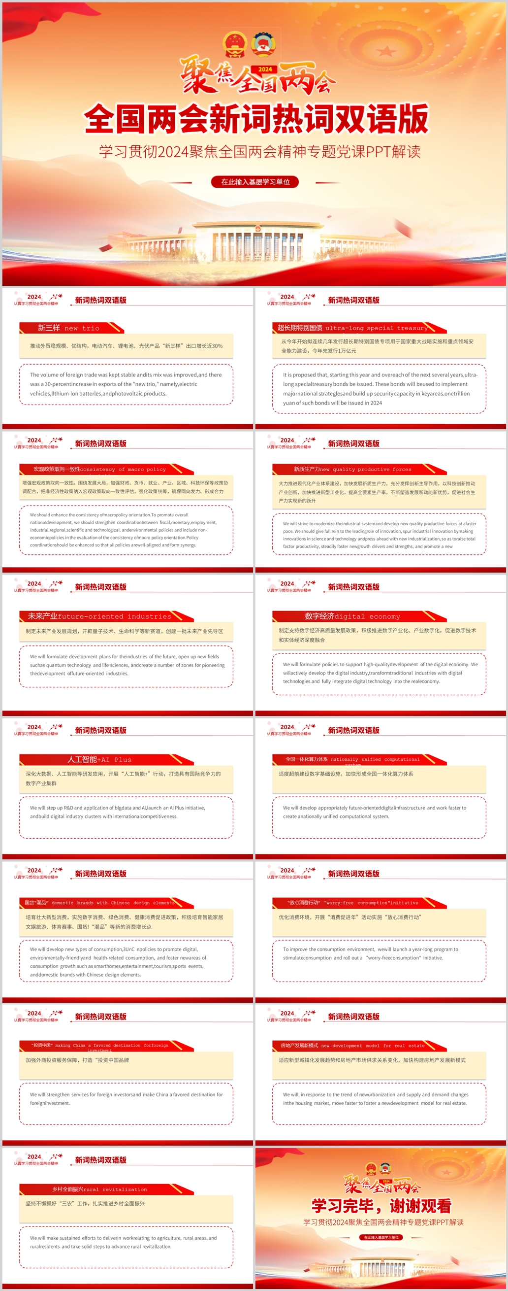 学习贯彻2024两会精神新词热词双语解读ppt模板(内含WORD演讲稿)