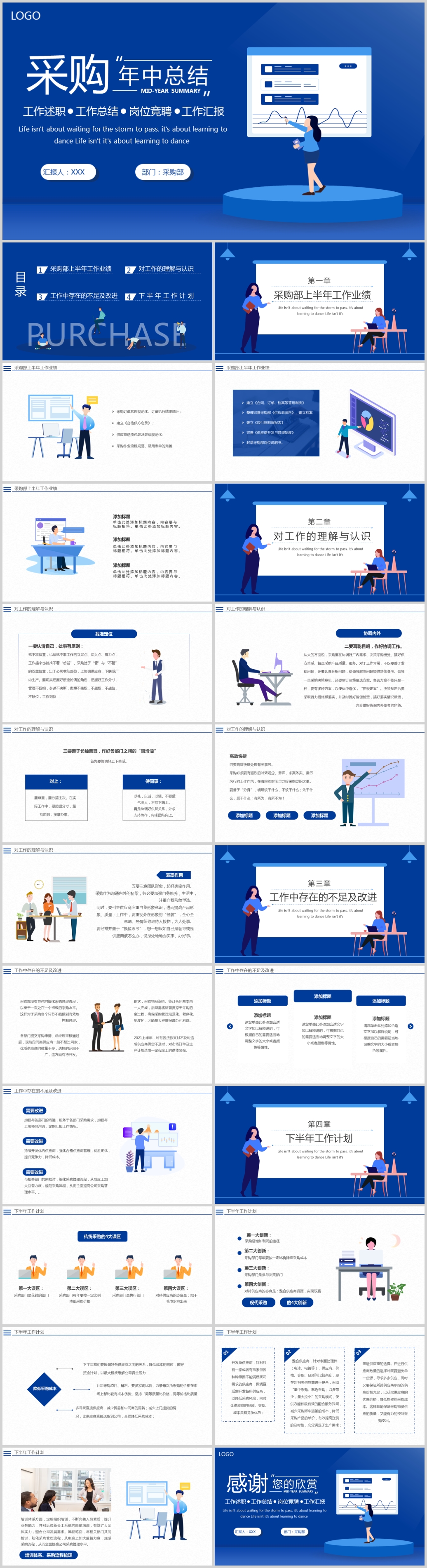 蓝色扁平采购部年中总结工作总结工作计划PPT模版