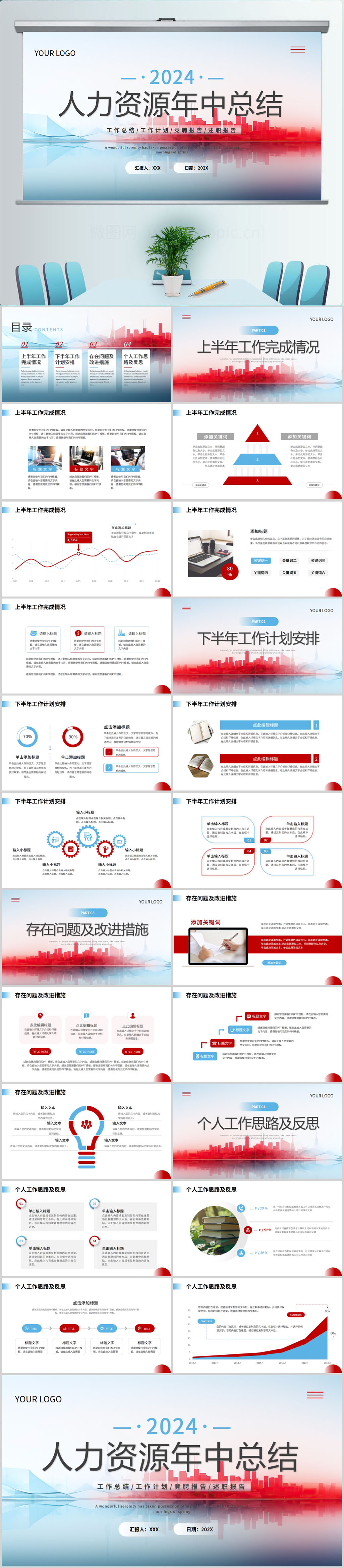 蓝色红色人力资源年中工作总结PPT模版设计
