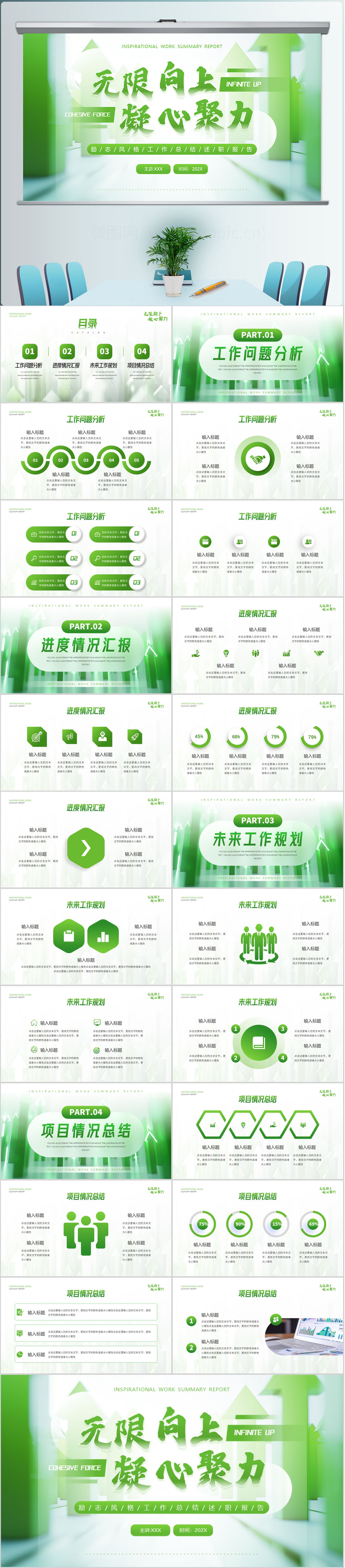 2024绿色清新工作总结无限向上凝心聚力通用ppt模板