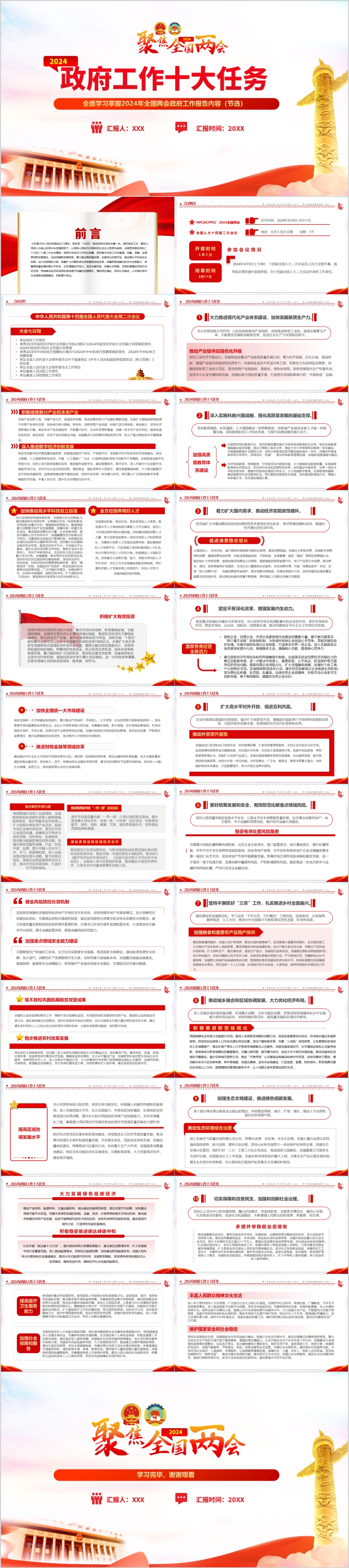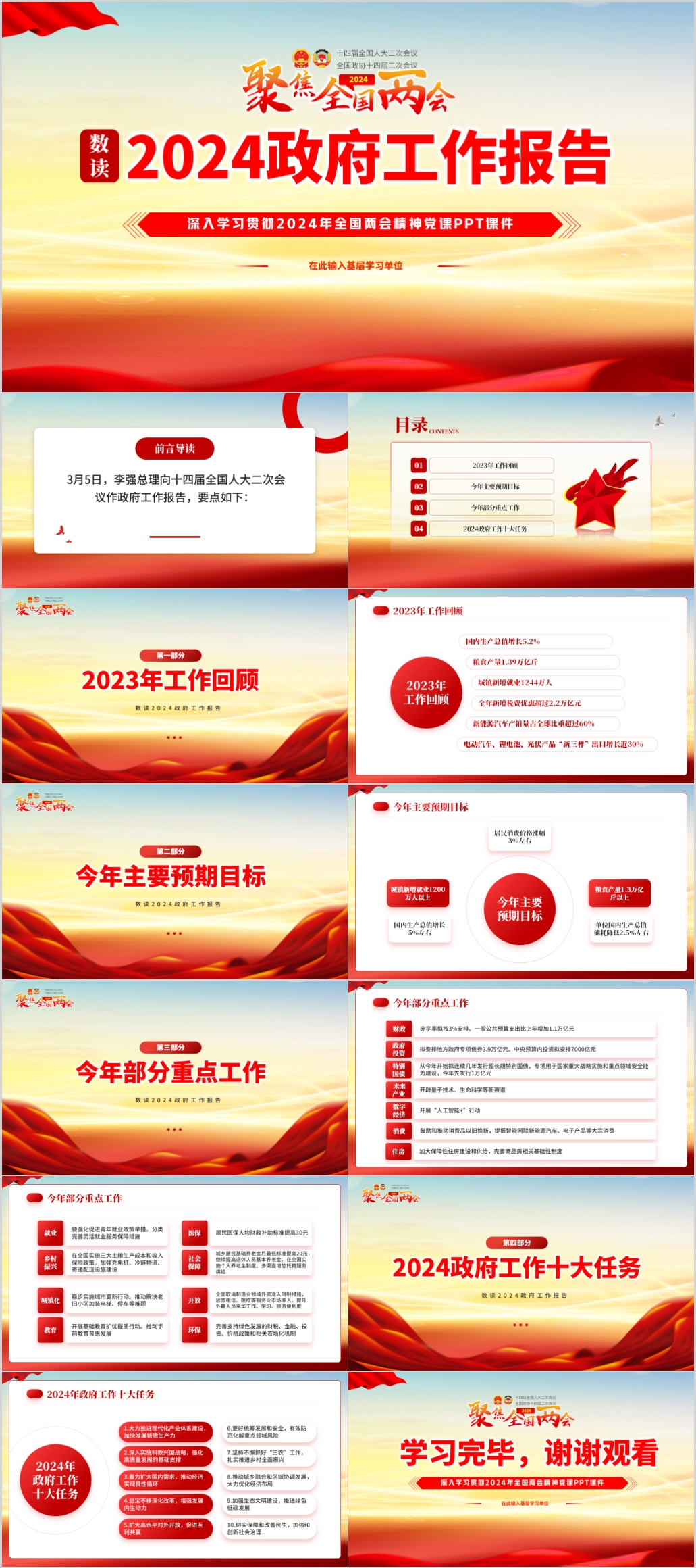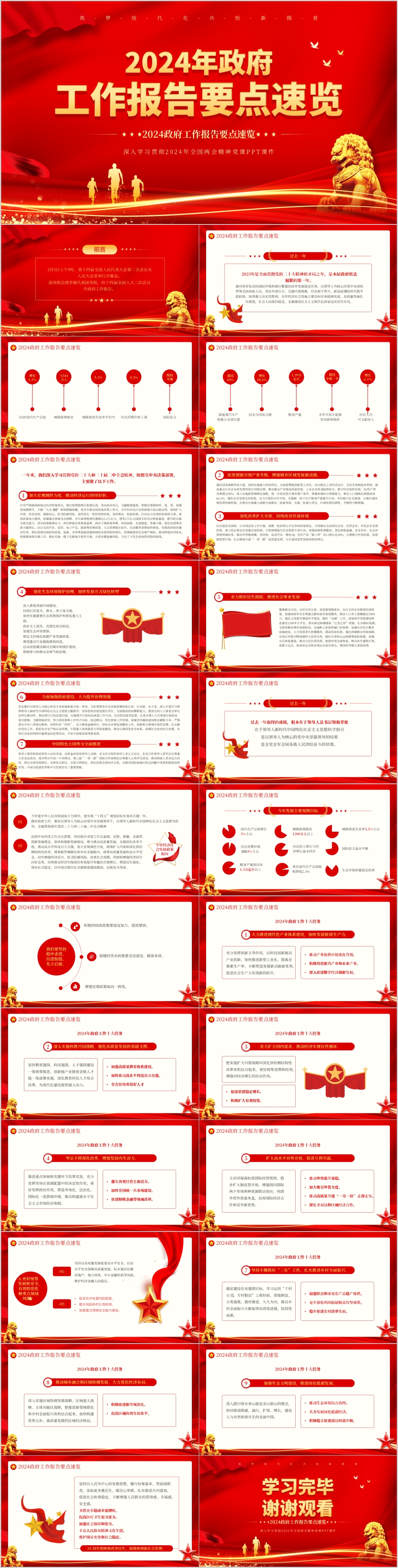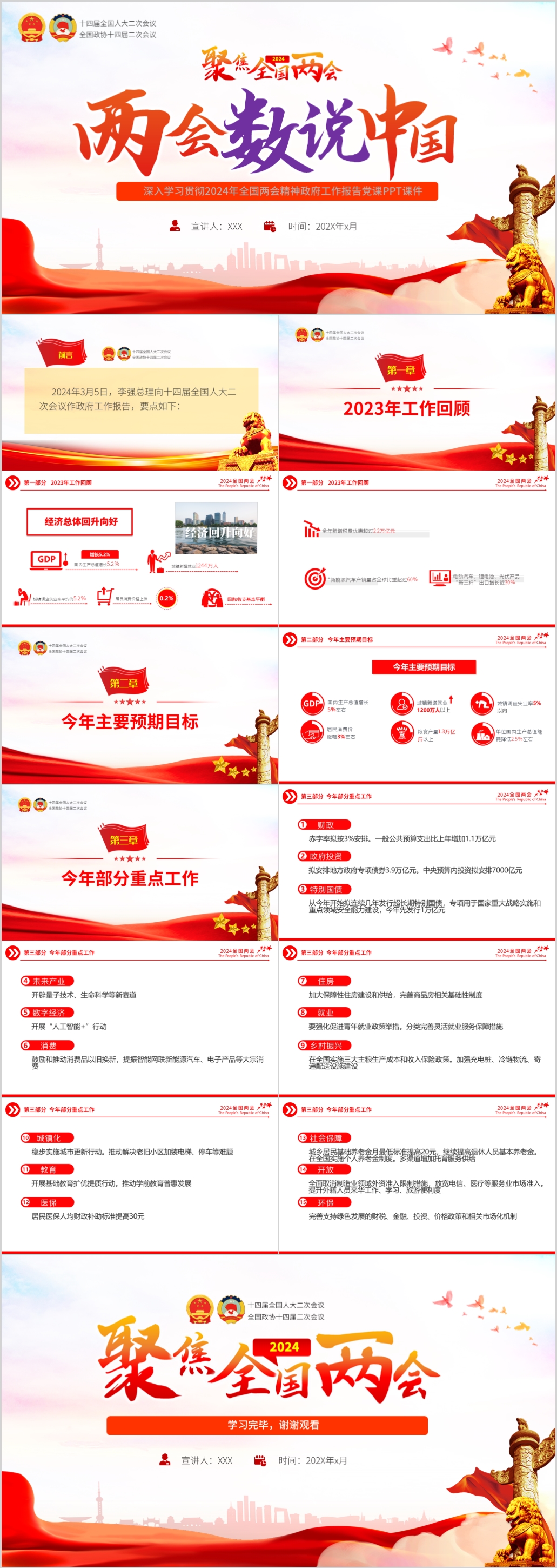 红色大气2024全国两会政府工作报告全文解读党课ppt模板(内含WORD演讲稿)