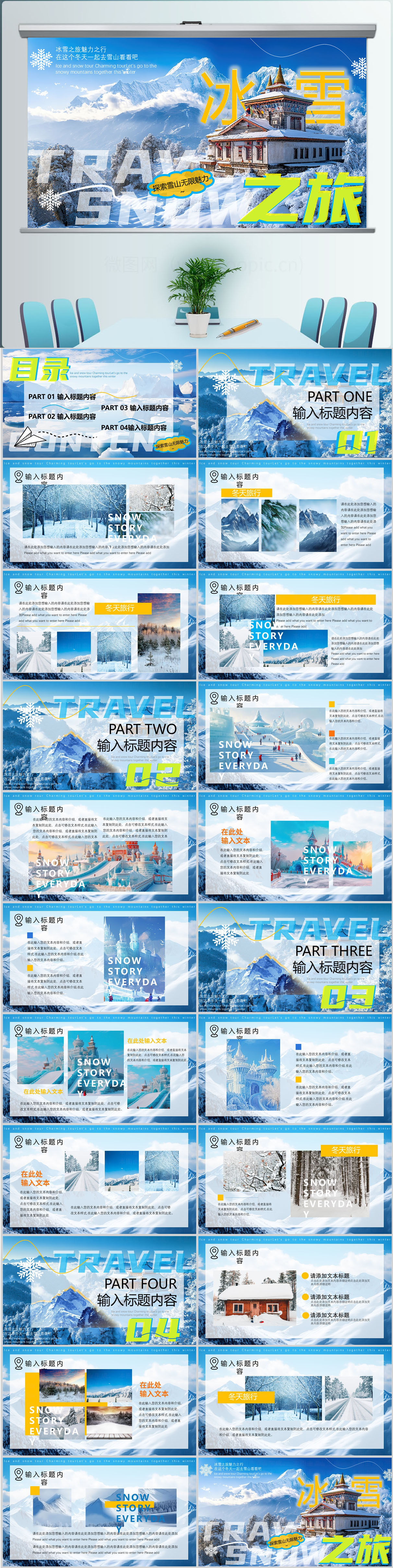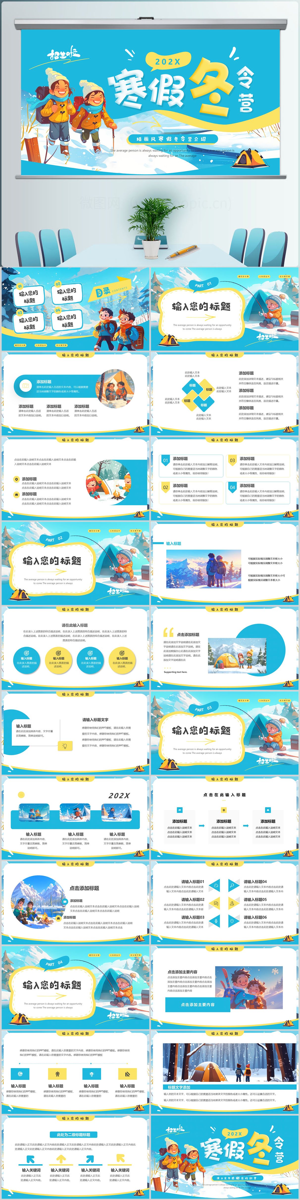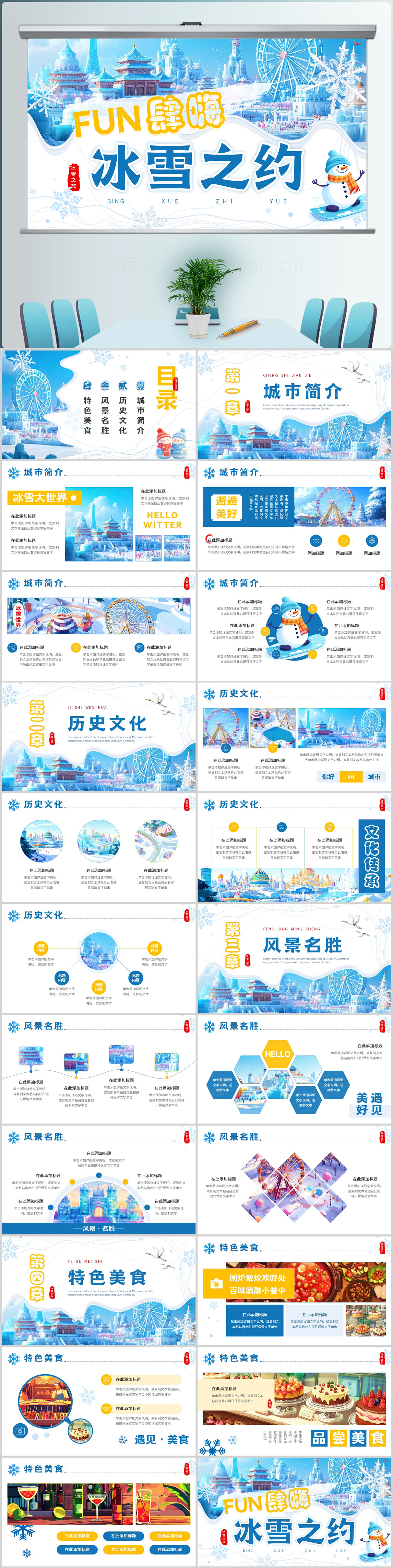 蓝色插画风冰雪之约冰雪大世界PPT模板设计