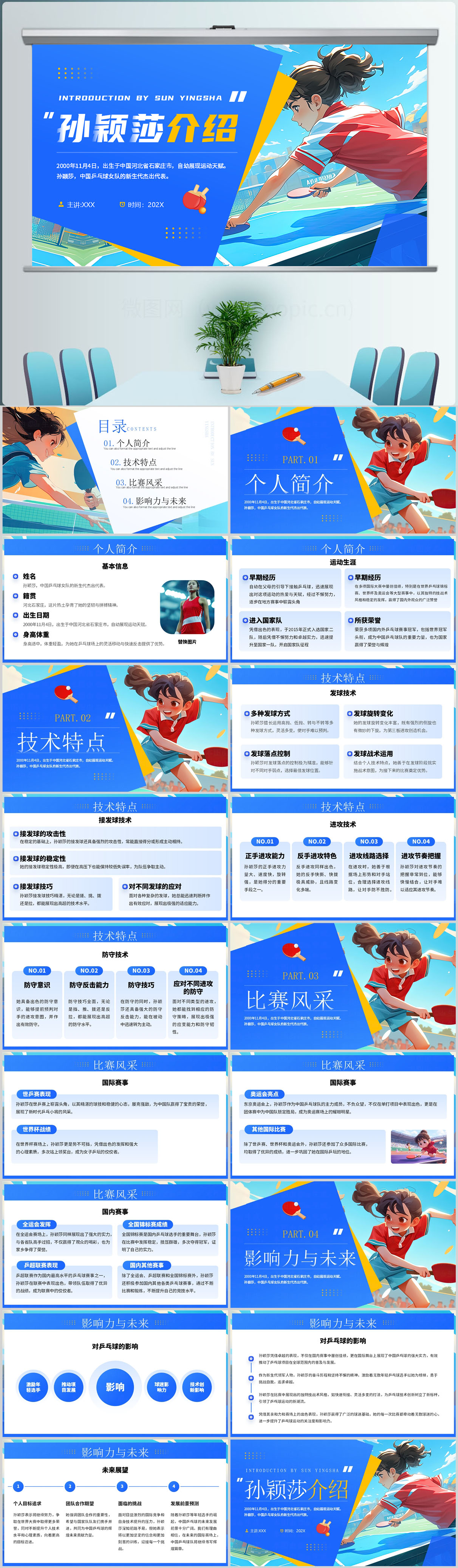 蓝色运动员孙颖莎介绍PPT模板设计