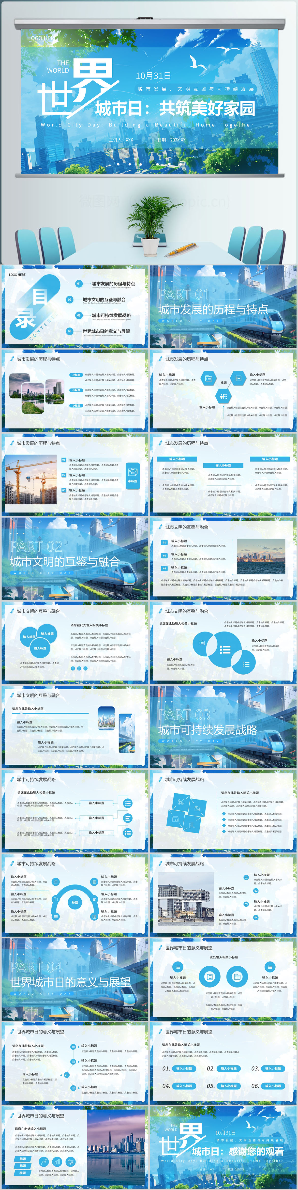 蓝色简约世界城市日宣传PPT模板设计
