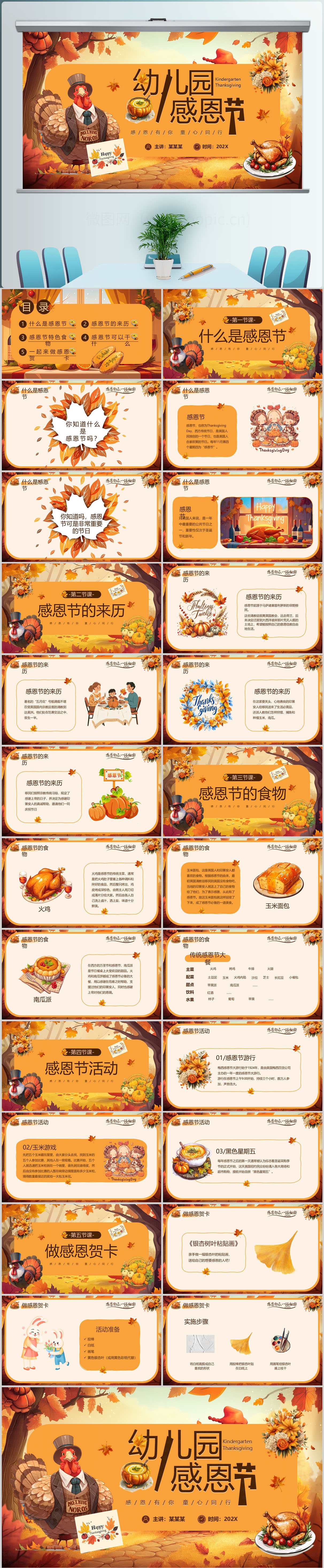 橙色插画风幼儿园感恩节PPT模板设计