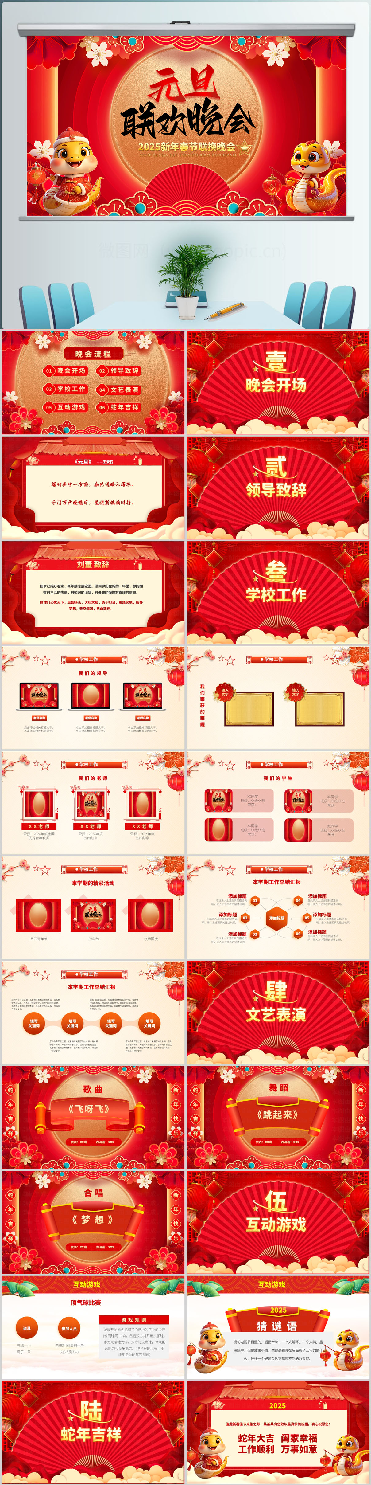 2025红色喜庆中国风学校新年元旦联欢晚会ppt模板