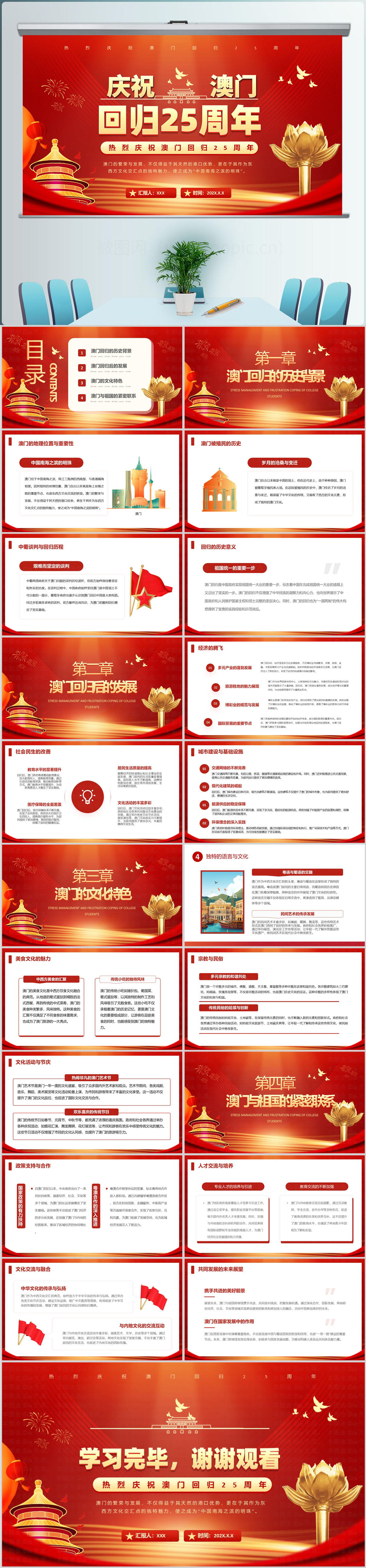红色大气澳门回归25周年ppt模板