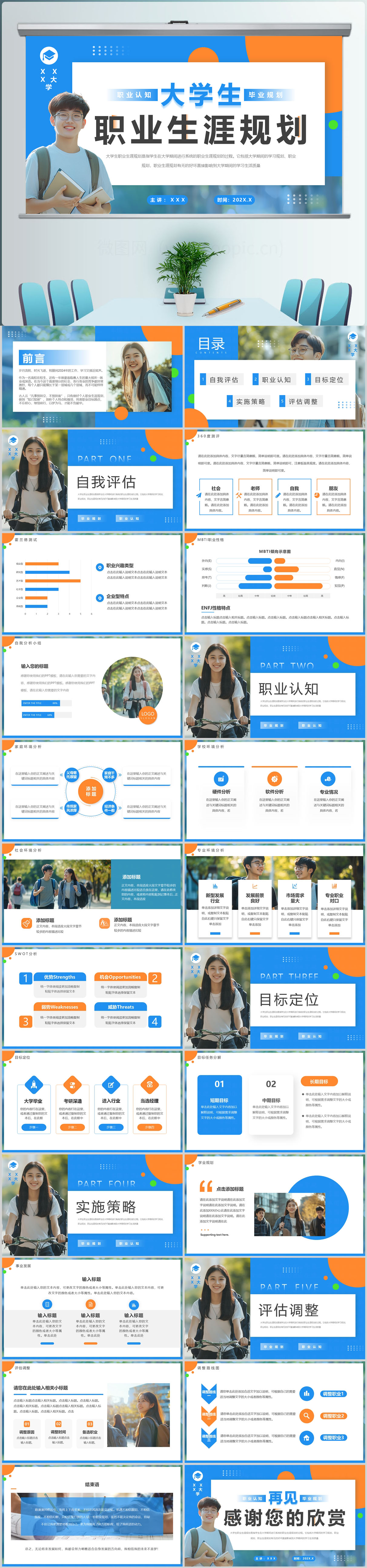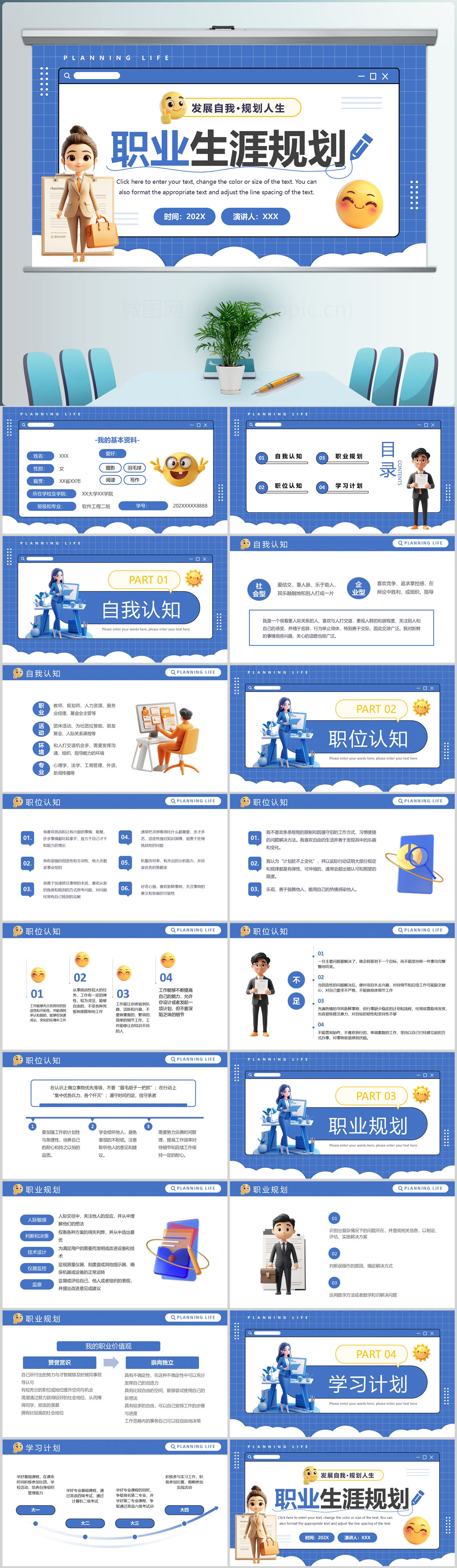 蓝色简约大学生职业生涯规划就业指导PPT模板设计