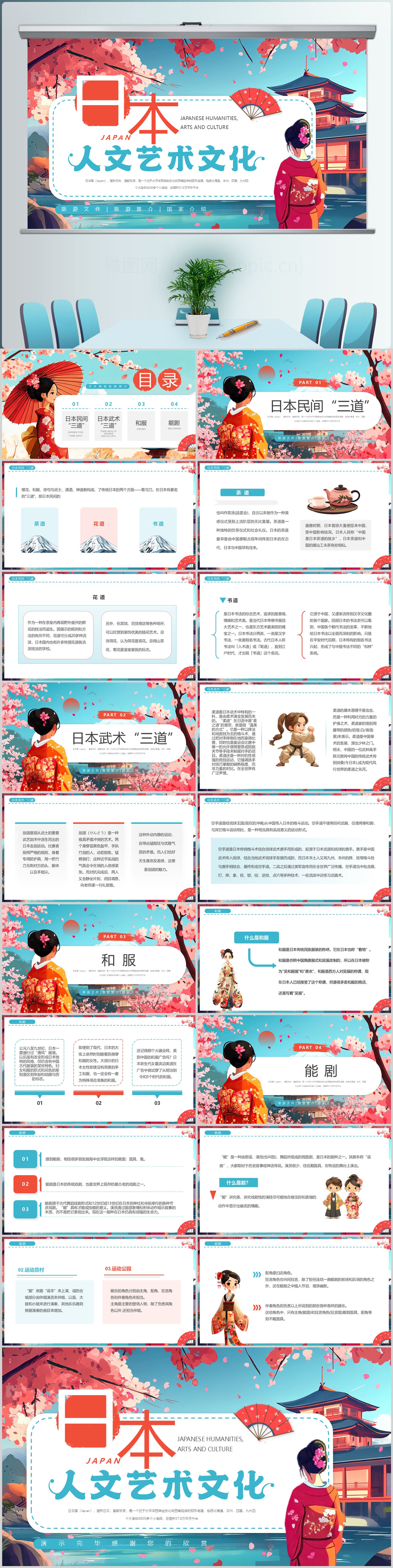 插画风日本人文艺术文化PPT模板设计