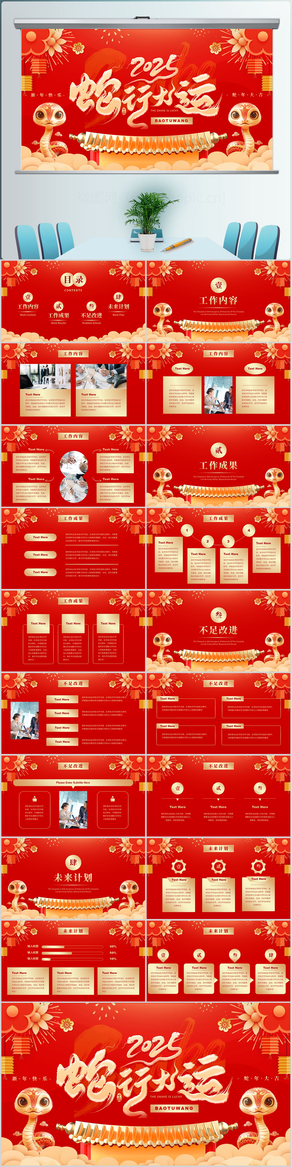 2025红色喜庆蛇行大运蛇年通用工作总结新年计划ppt模板