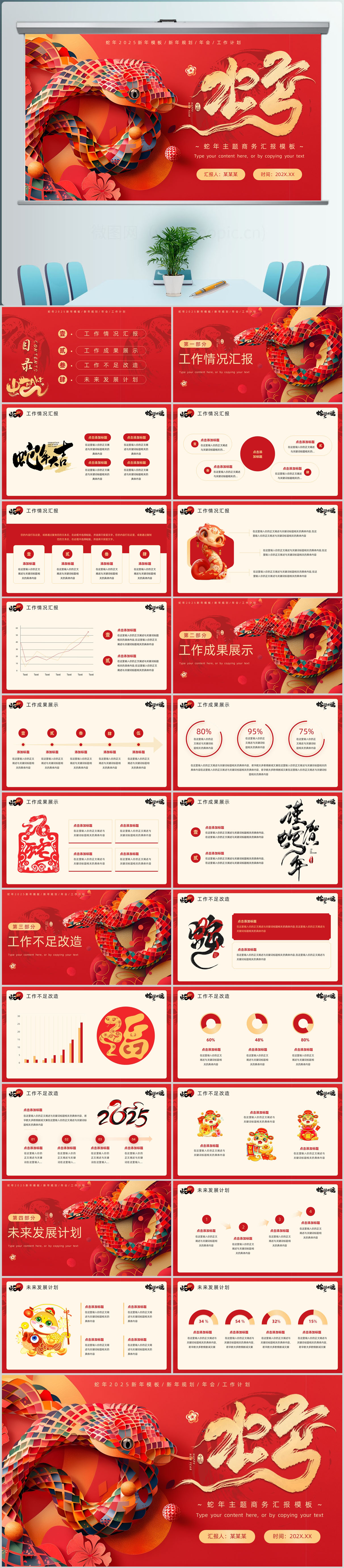 2025红色中国风蛇年大吉工作总结计划通用ppt模板