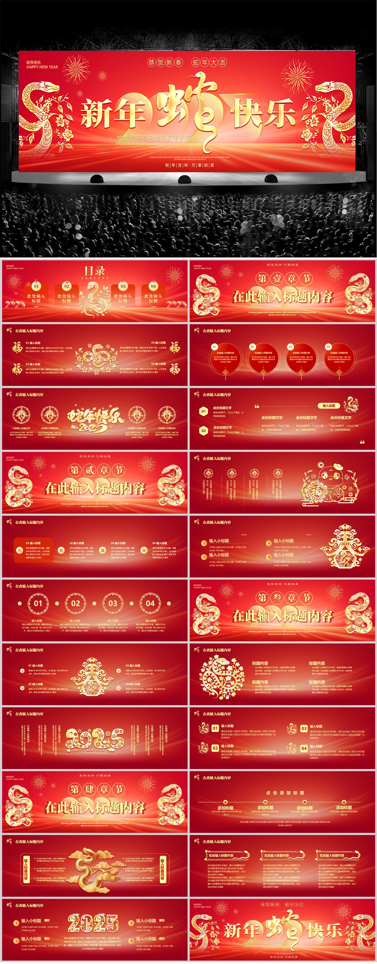 2025红色蛇年新年快乐年终总结新年计划宽屏ppt模板
