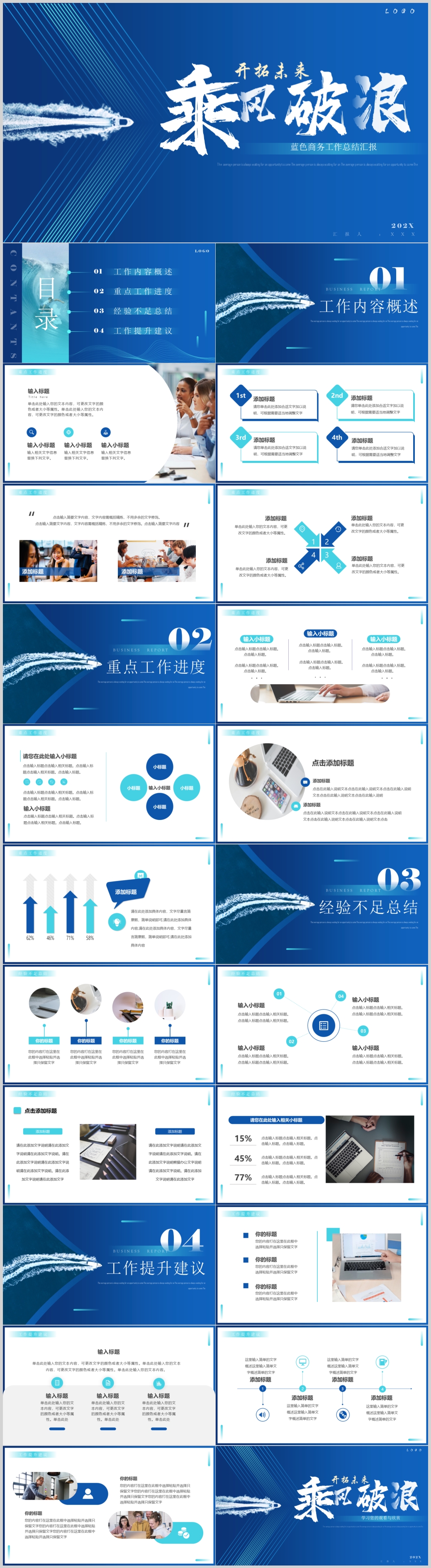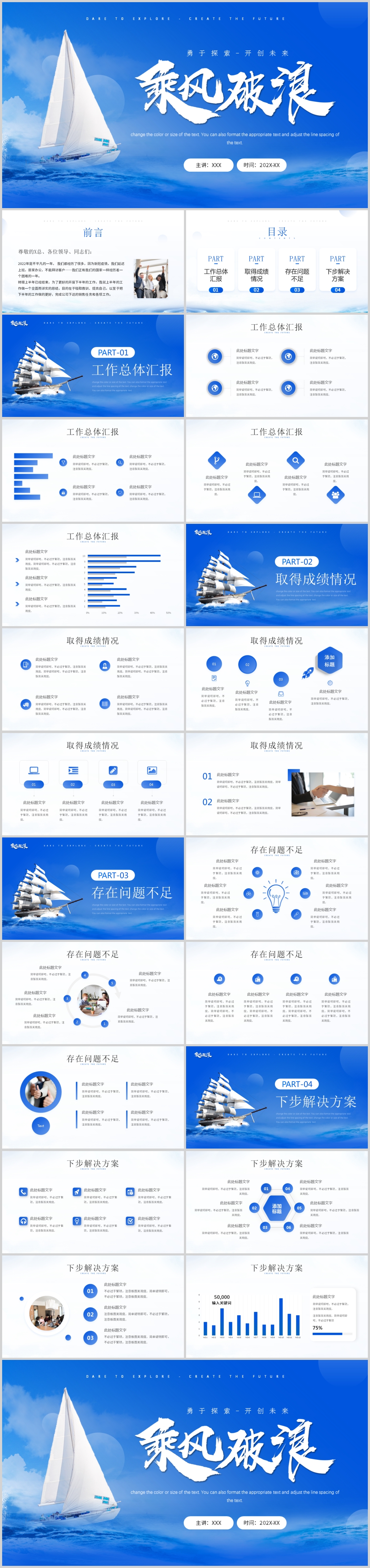 2023年蓝色乘风破浪年终总结汇报计划PPT模板