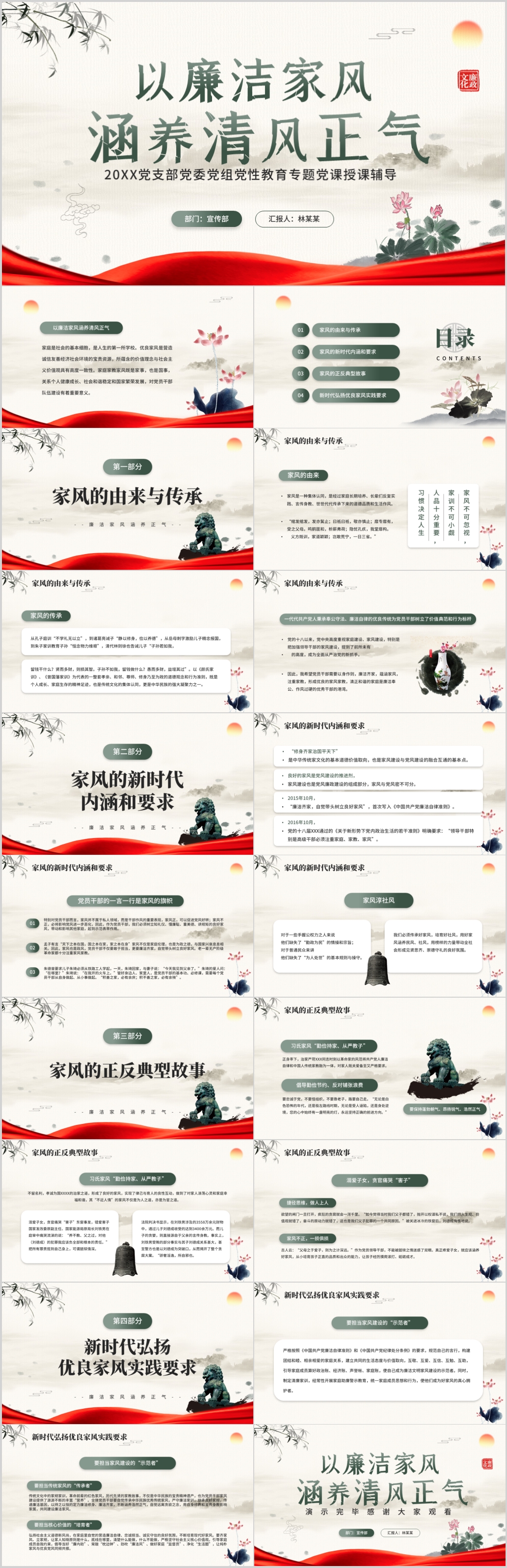 中国风以廉洁家风涵养清风正气廉政党性教育党课PPT模板