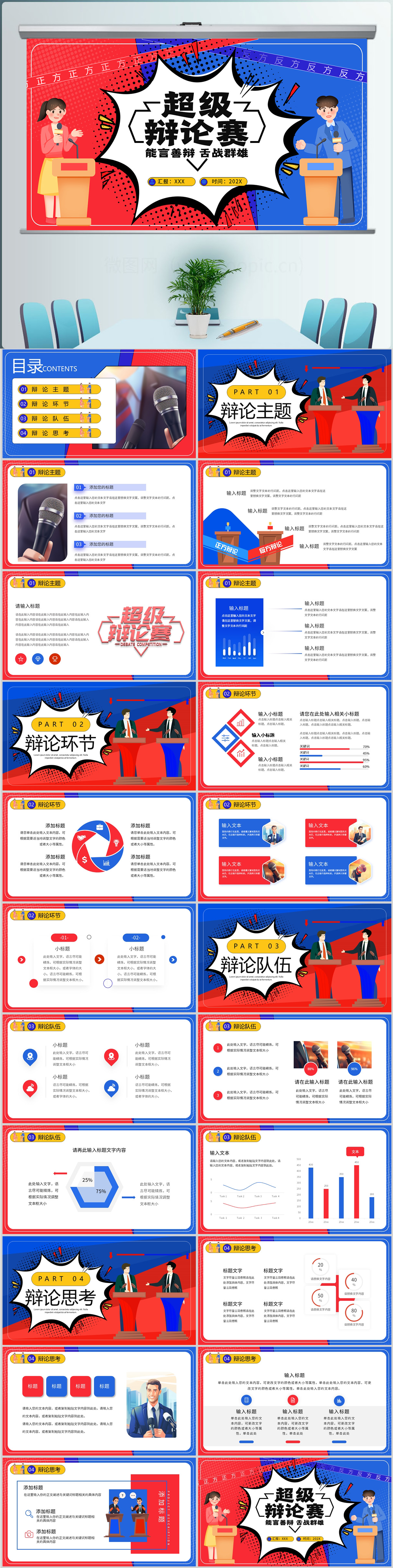 红蓝双色卡通风辩论大赛PPT模板