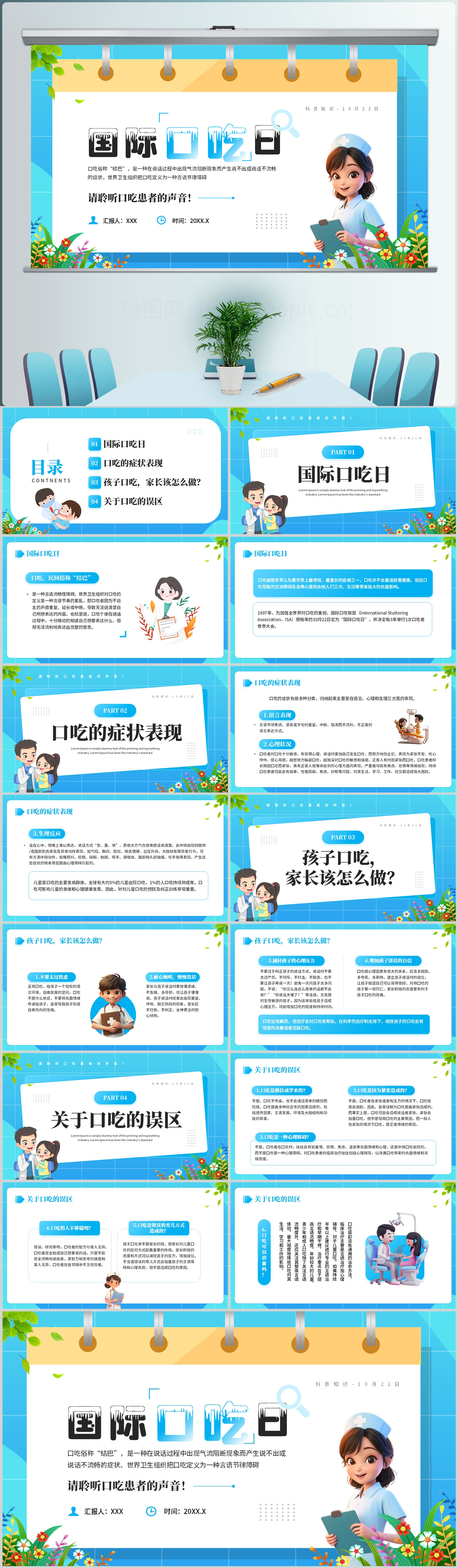 卡通蓝色国际口吃日主题介绍学习课件ppt模板