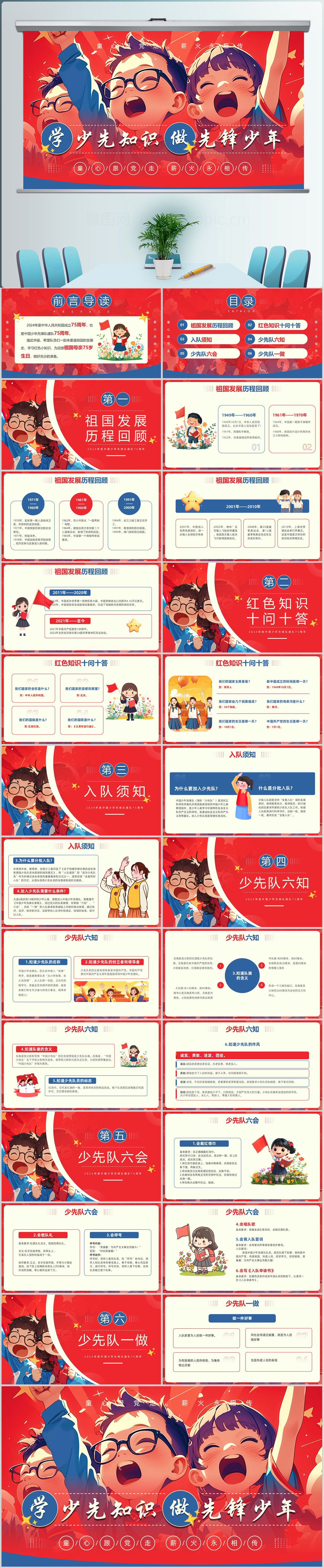 红色插画风学少先知识做先锋少年少先队主题课件PPT模板