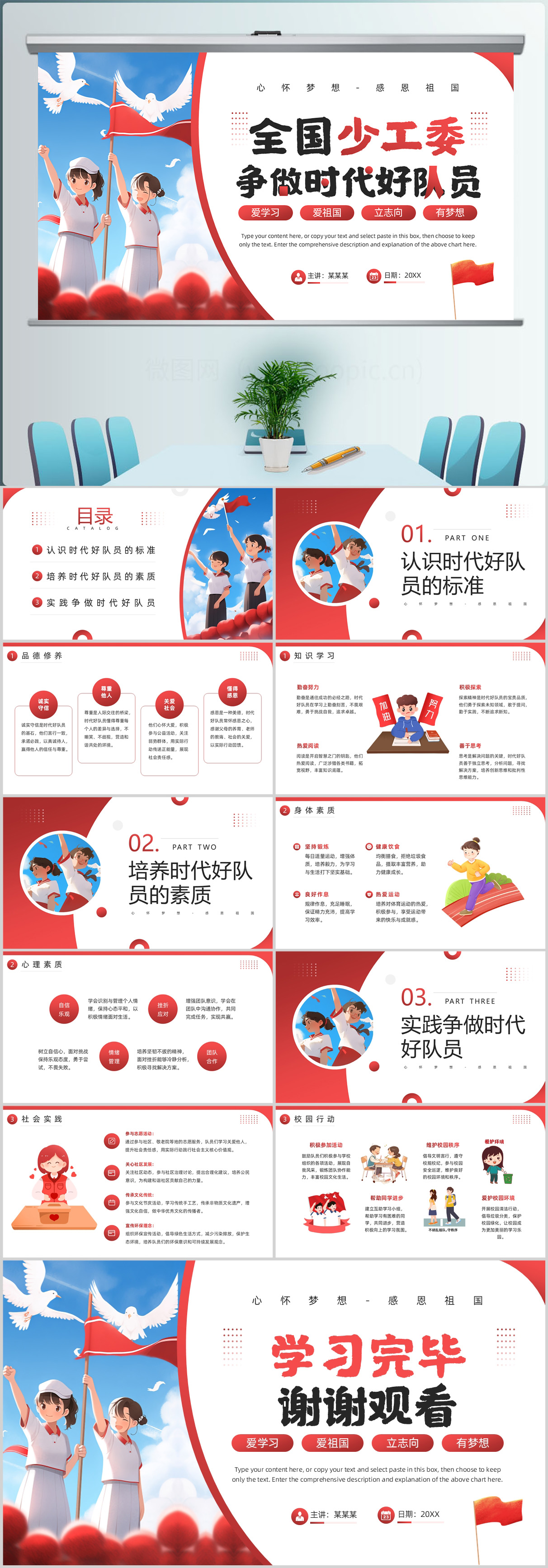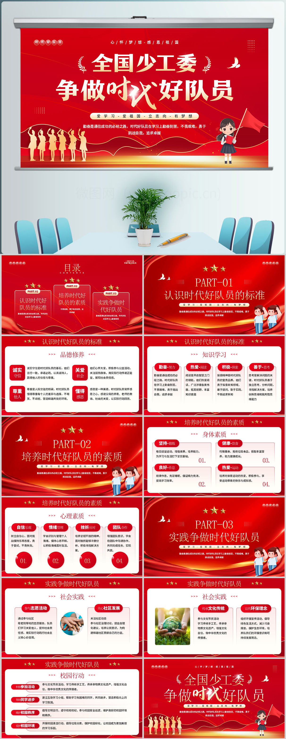 红色简约插画风全国少工委争做时代好队员课件PPT模板