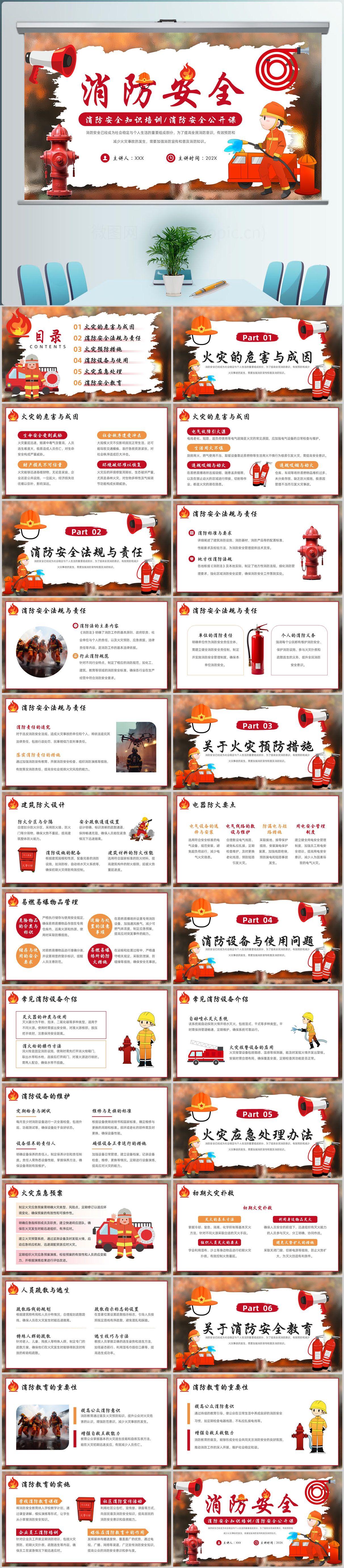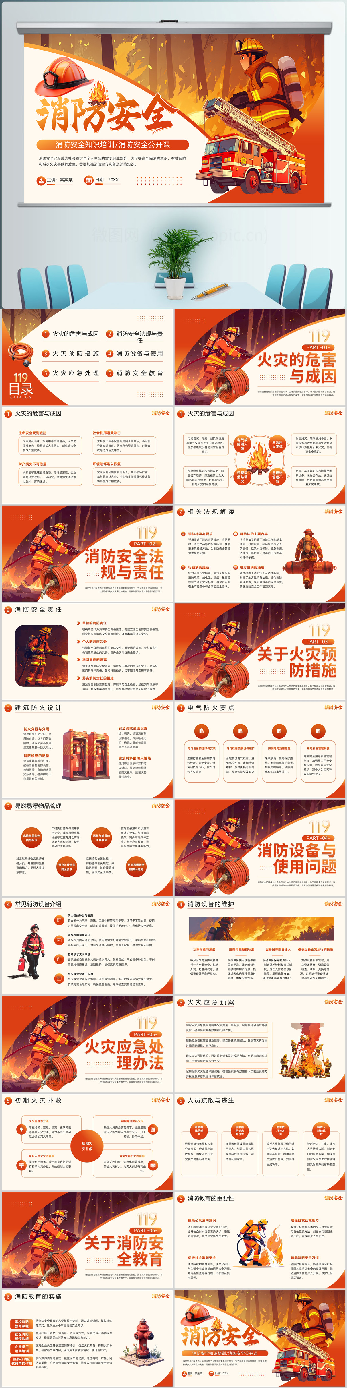 红色插画风119消防日宣传中国消防安全知识培训公开课PPT模板