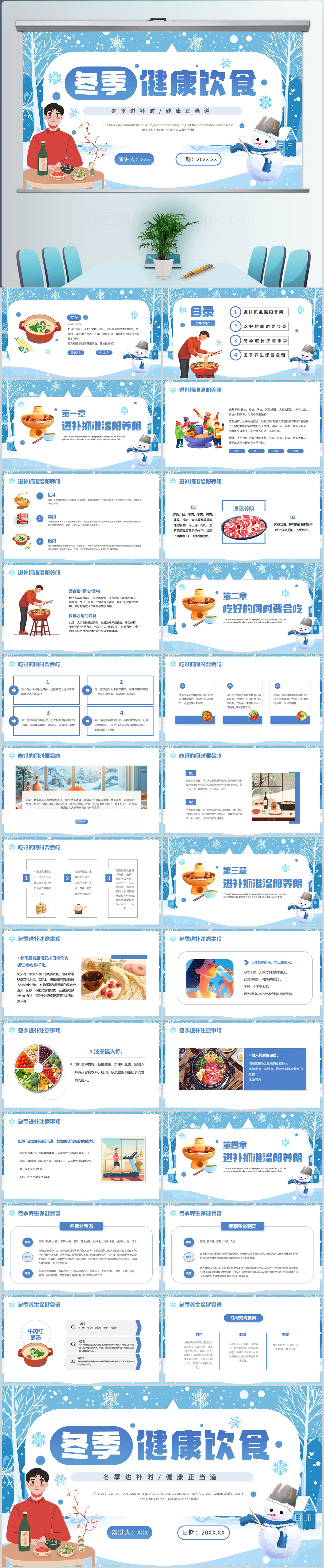 卡通风冬季健康饮食宣传介绍PPT模板设计