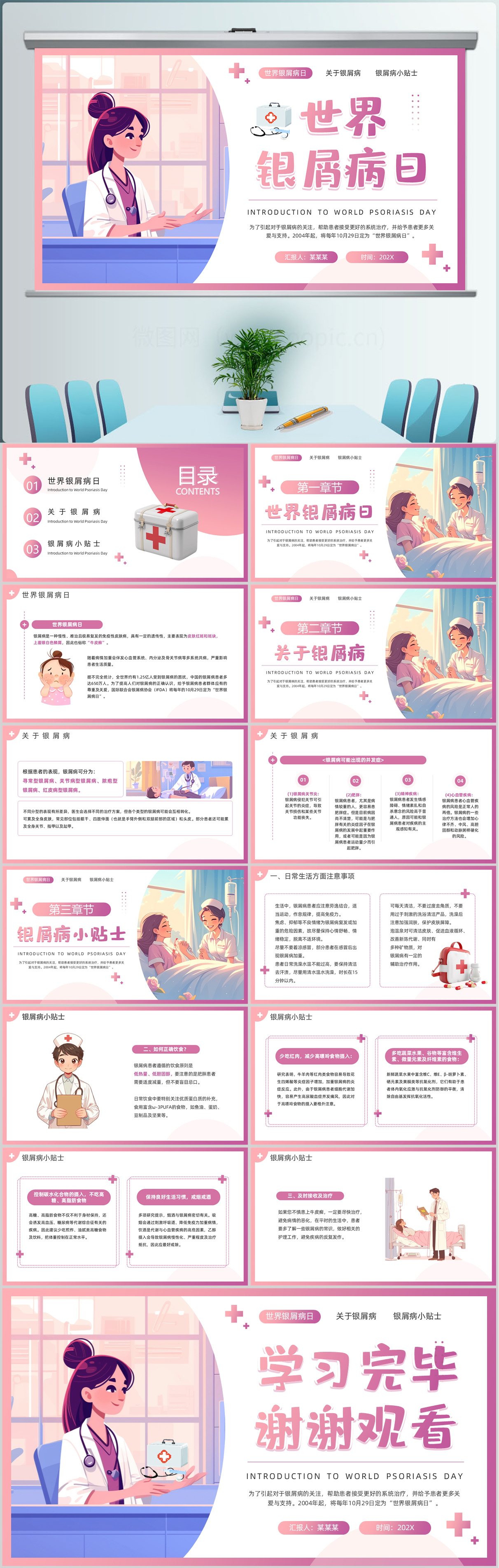 2024粉色插画风世界银屑病日介绍课件PPT模板