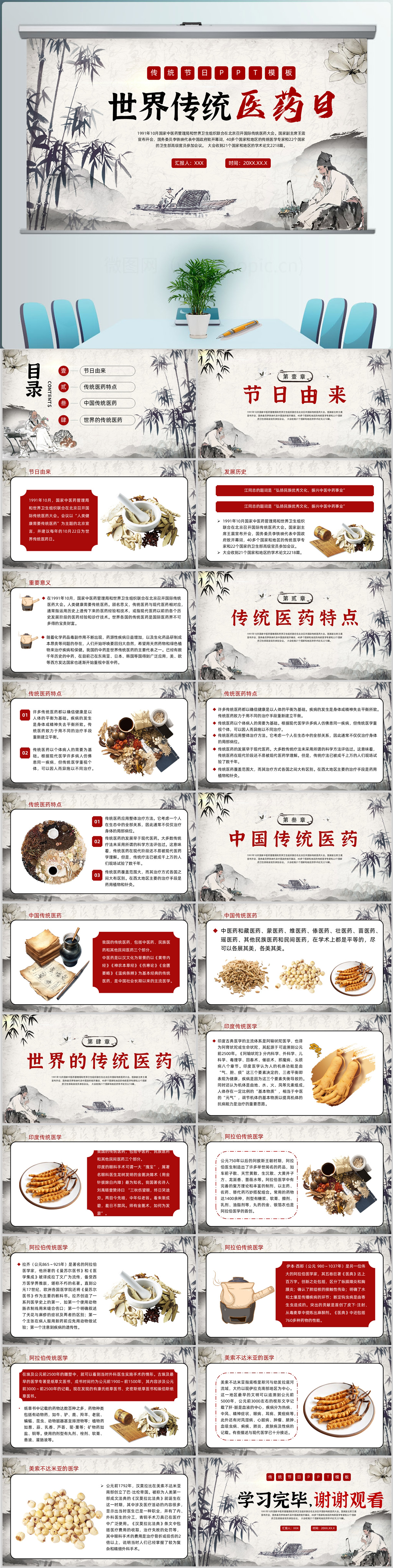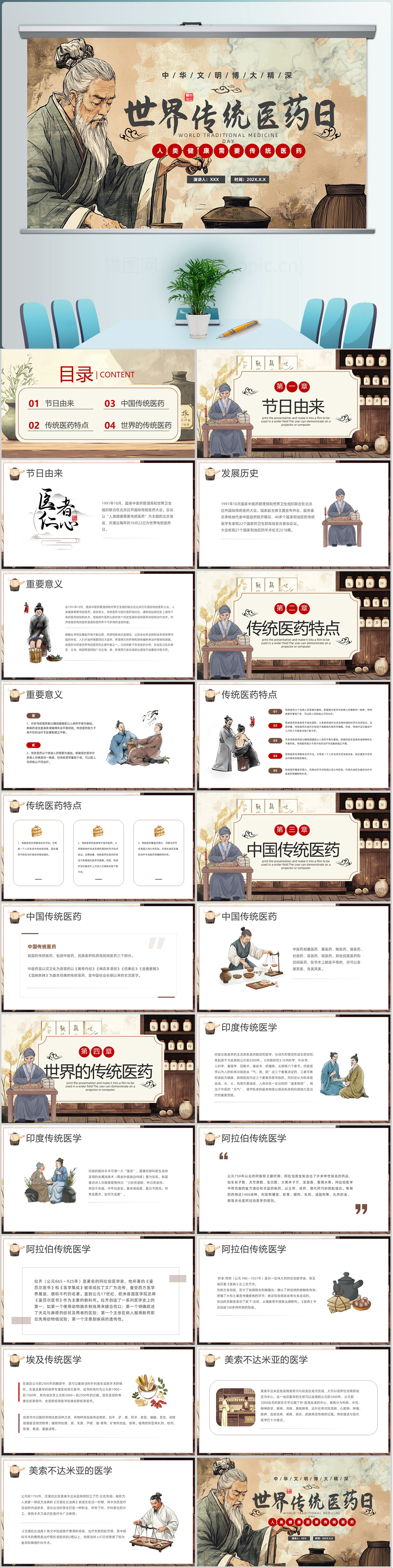 中国风古典世界传统医药日主题介绍ppt模板