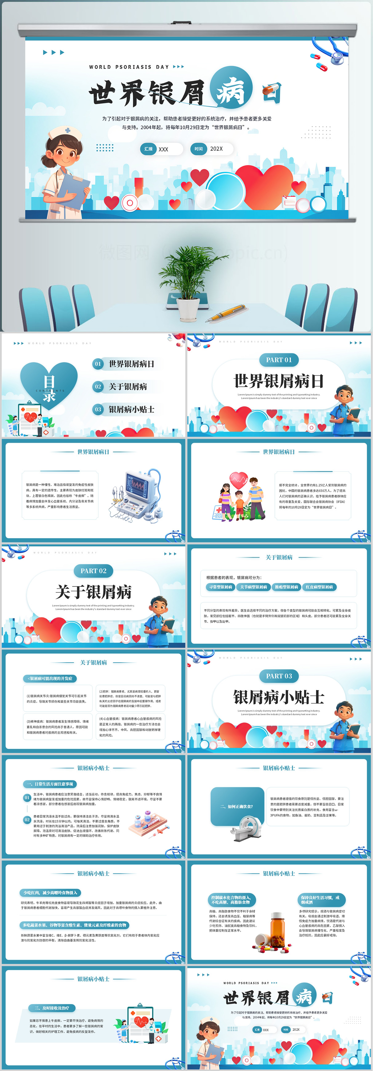 蓝色卡通世界银屑病日介绍ppt模板