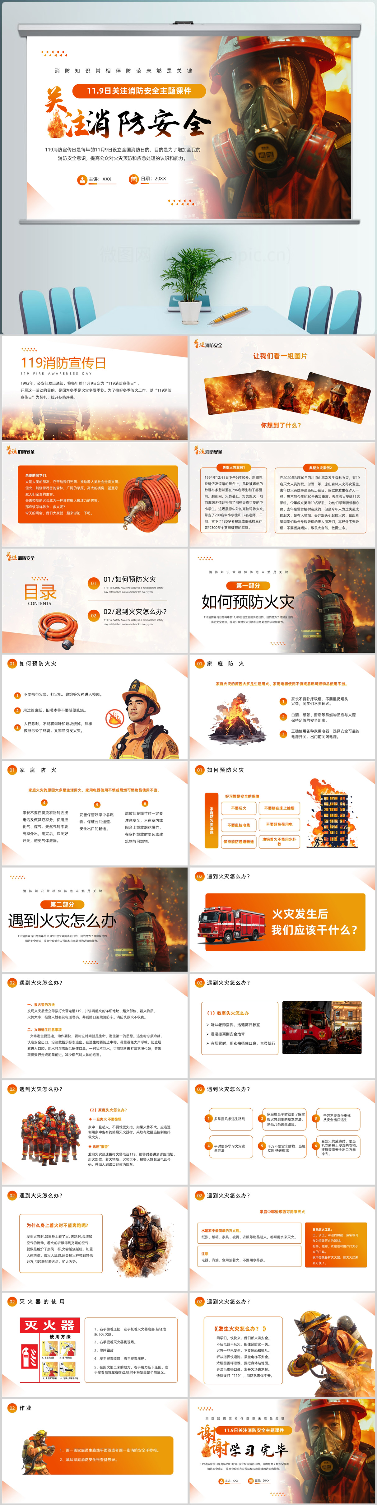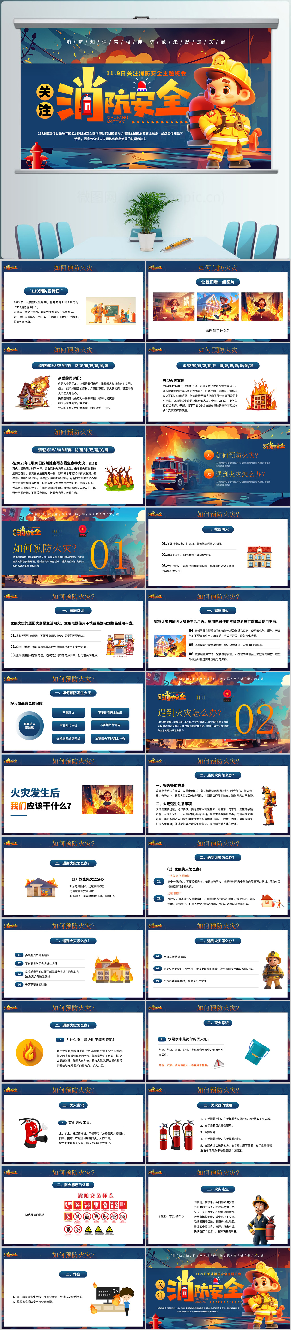 卡通119消防宣传日关注消防安全主题班会课件ppt模板