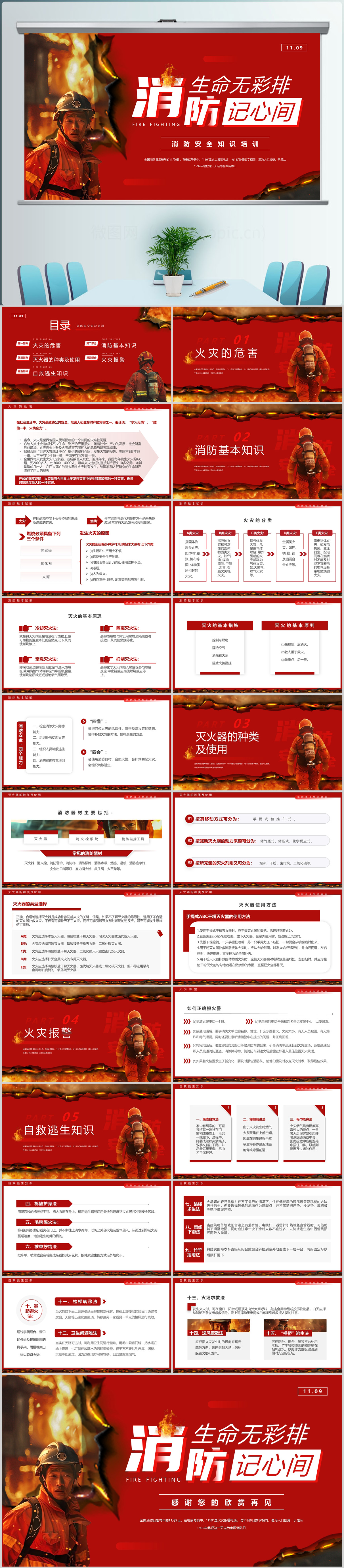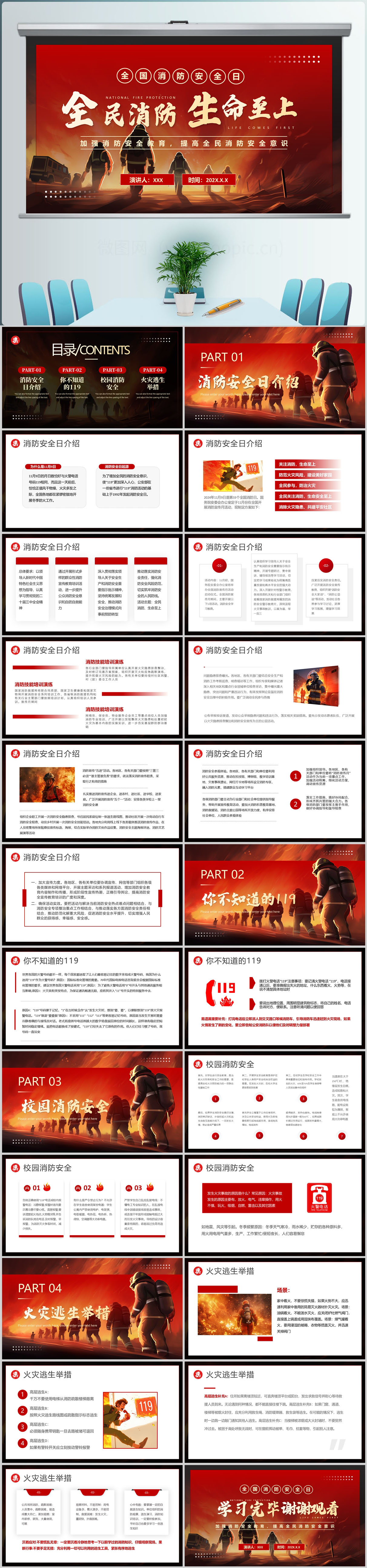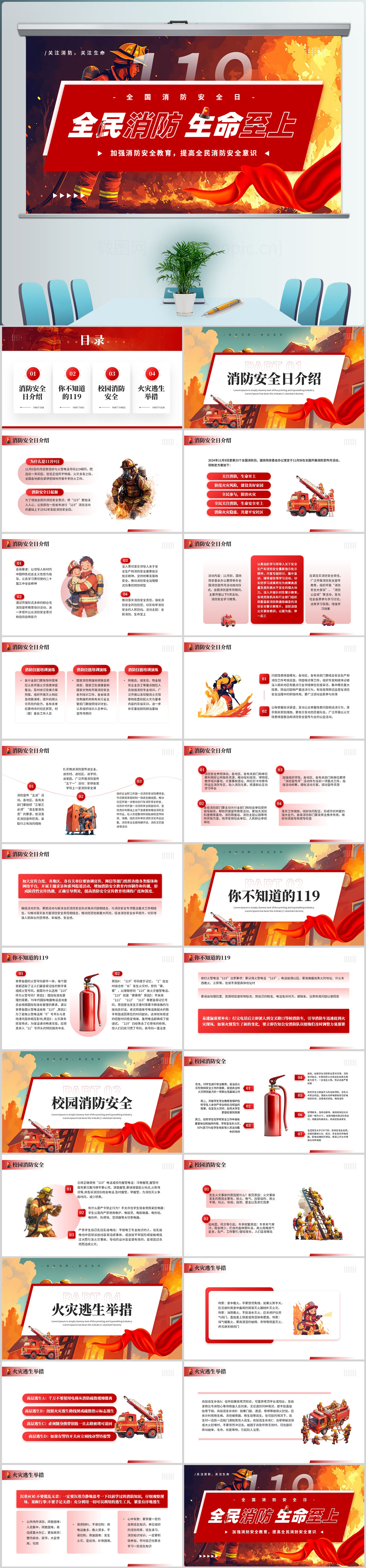 红色全民消防生命至上全国消防日宣传主题教育课件ppt模板